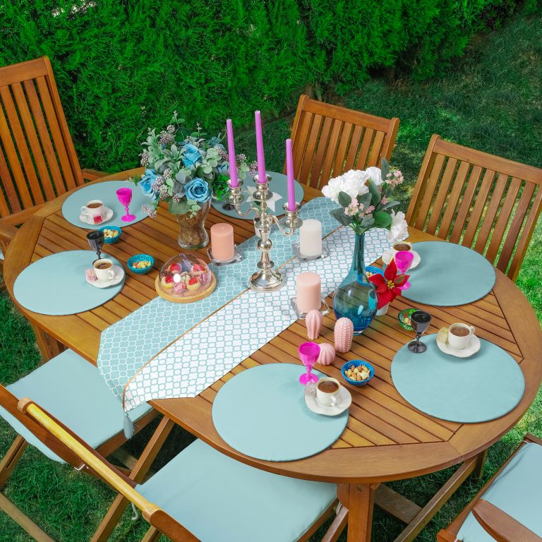 Realhomes Mint Yeşili & Beyaz Ogea Desenli Püsküllü Runner & 6’lı Mint Yeşili Düz Renk Supla – Servis Altlığı