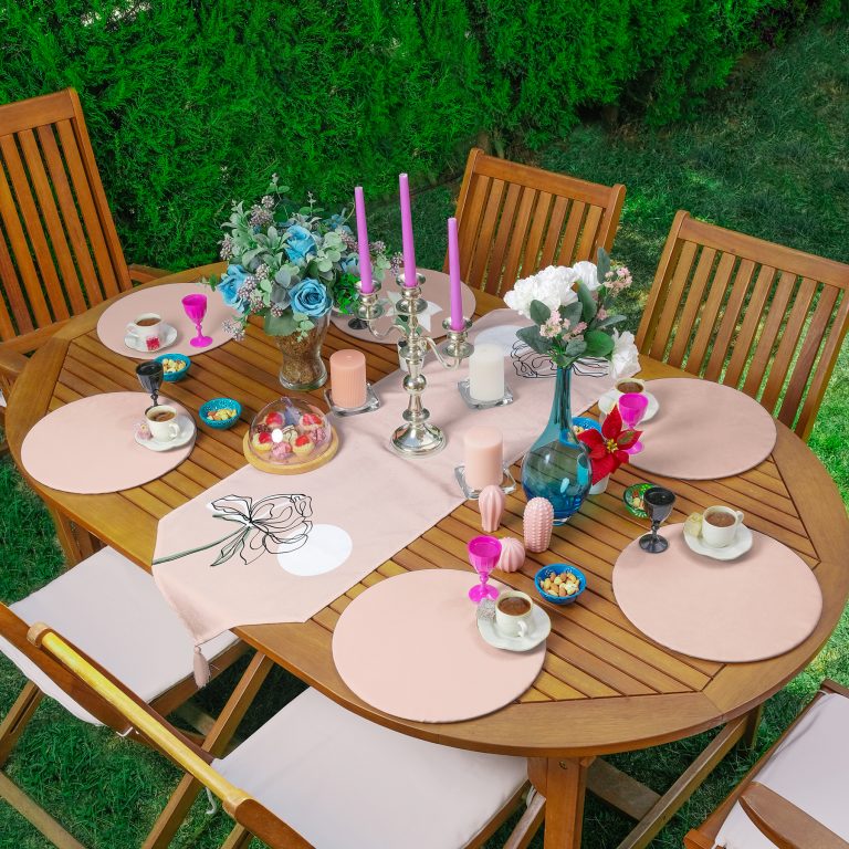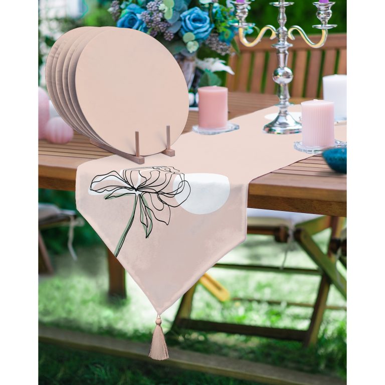 Realhomes Pembe Zemin Oneline Gül Çizimli Püsküllü Runner & 6’lı Pembe Düz Renk Supla – Servis Altlığı