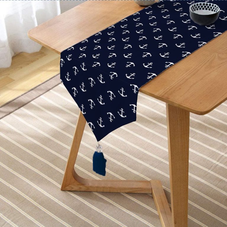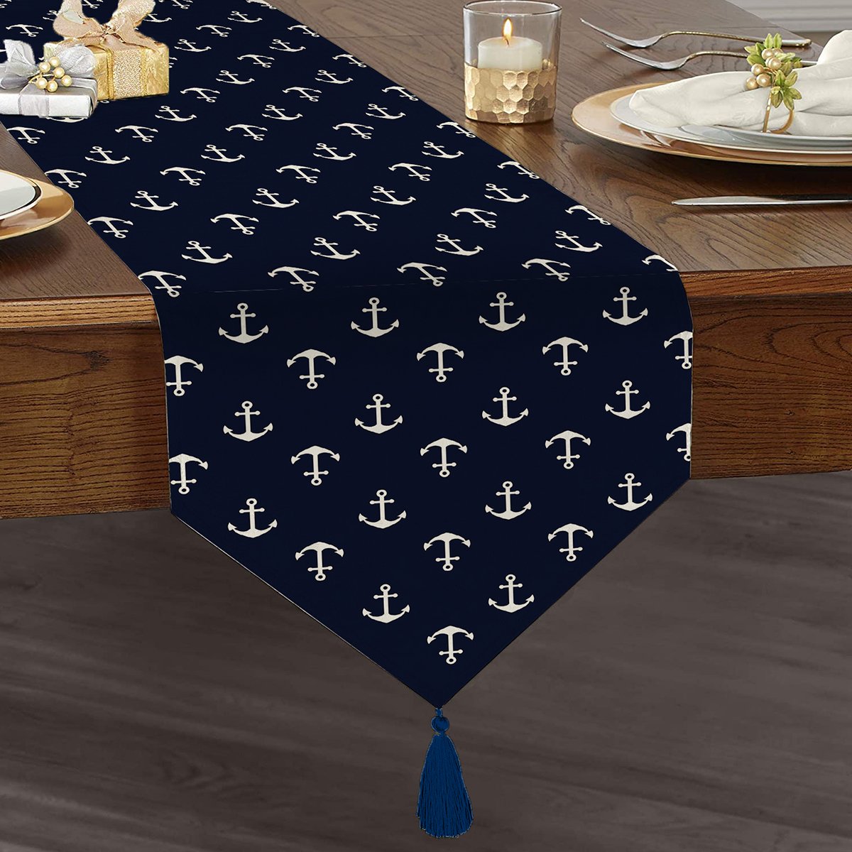 Realhomes Renkli Zemin Üzerinde Beyaz Çapa Desenli Dijital Baskılı Özel Tasarım Püsküllü Şönil Üçgen Runner