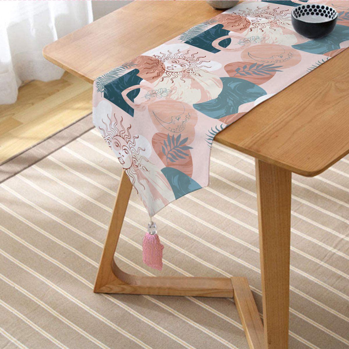 Realhomes Renkli Zeminde Soyut Çizimli Dijital Baskılı Özel Tasarım Püsküllü Şönil Üçgen Runner