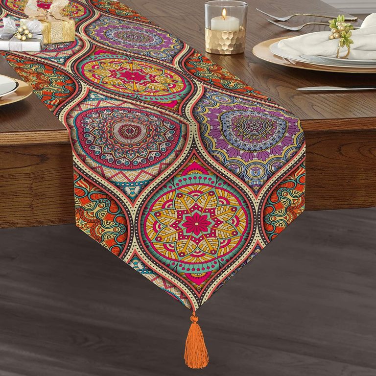 Realhomes Sarmal Daire Desenli Çini Motifli Dijital Baskılı Özel Tasarım Püsküllü Şönil Üçgen Runner