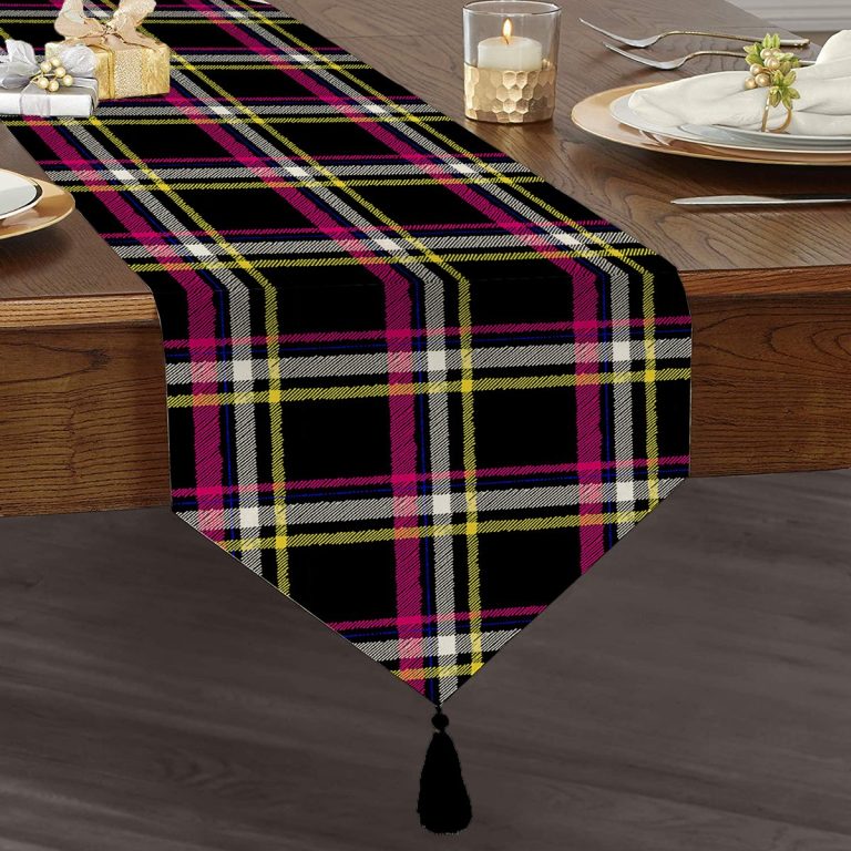 Realhomes Siyah Sarı Pembe Ekose Desenli Dijital Baskılı Dekoratif Özel Tasarım Püsküllü Şönil Üçgen Runner