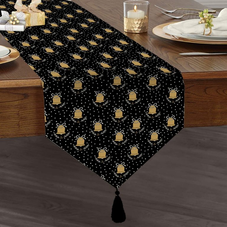 Realhomes Siyah Zemin Üzerinde Gold Renkli Çan Desenli Dijital Baskılı Özel Tasarım Püsküllü Şönil Üçgen Runner