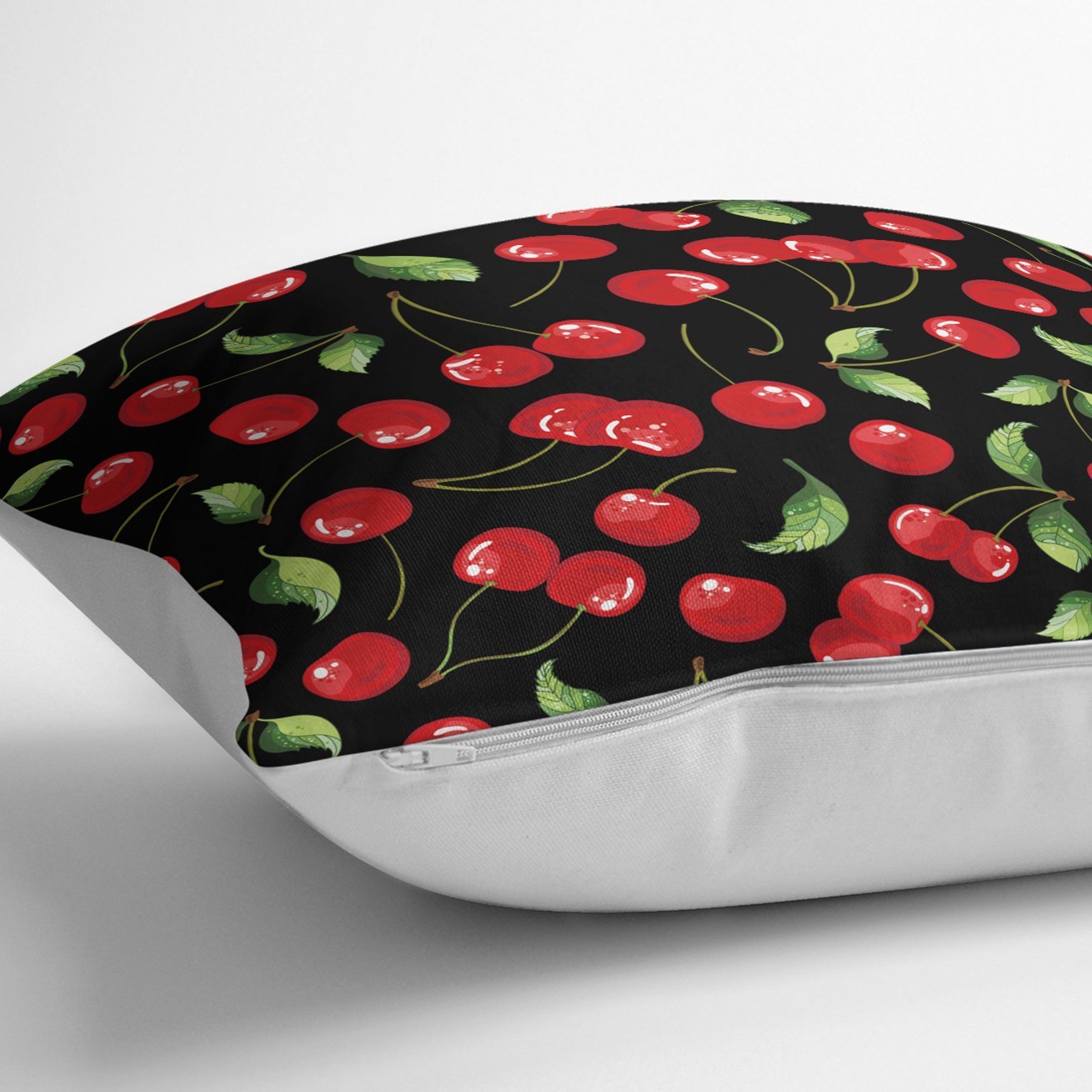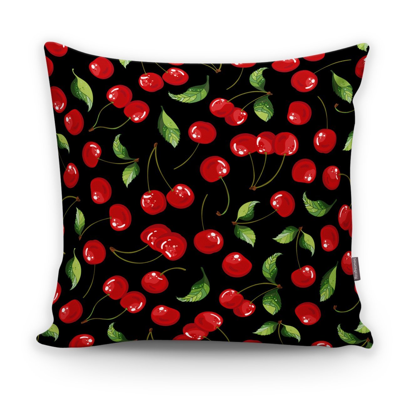 Realhomes Siyah Zeminde Kiraz Desenli Dijital Baskılı Modern Yastık Kılıfı