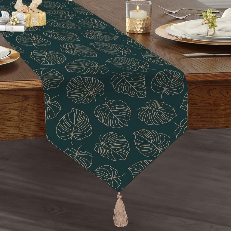 Realhomes Siyah Zeminli Gold Çizgili Yaprak Desenli Dijital Baskılı Özel Tasarım Püsküllü Şönil Üçgen Runner