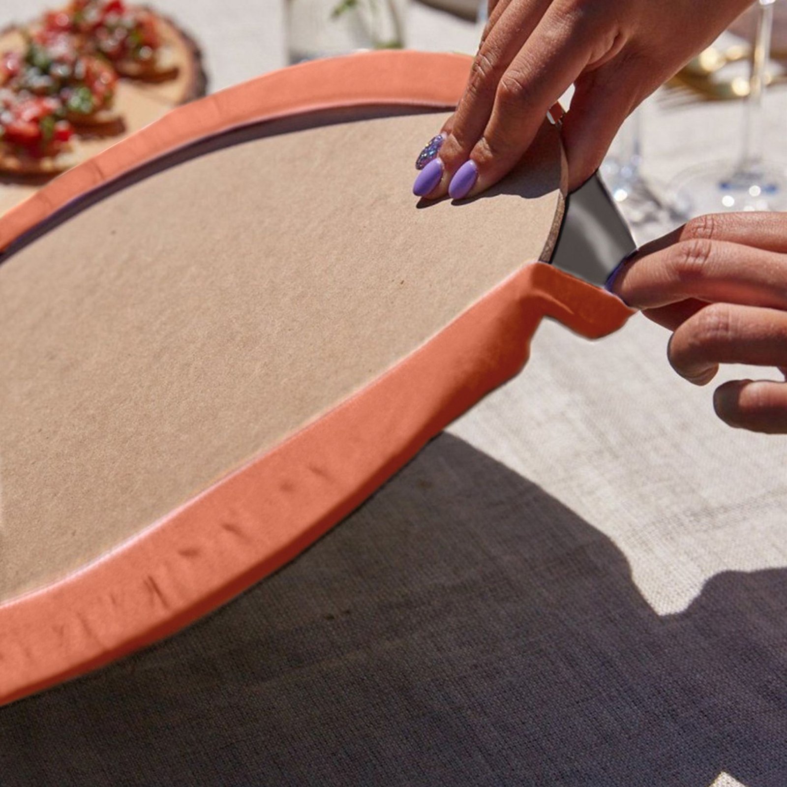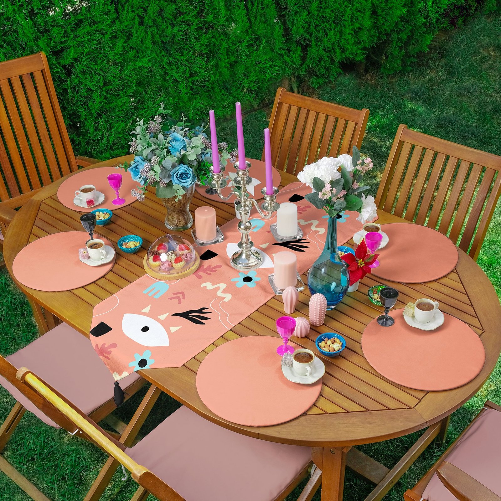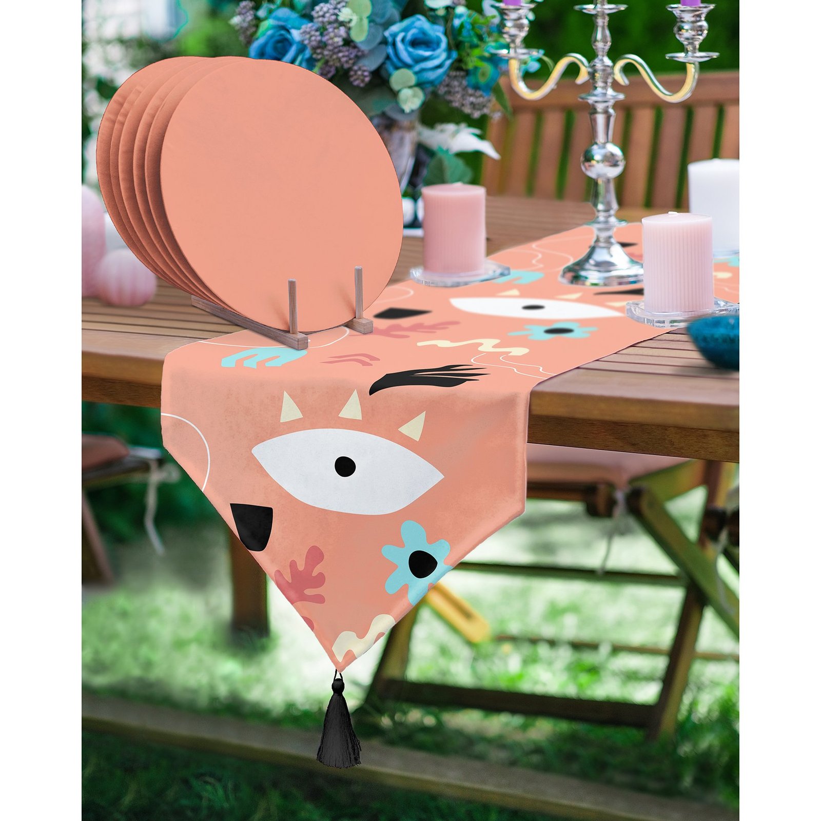 Realhomes Turuncu Zemin Onedraw Motifli Püsküllü Runner & 6’lı Terra Düz Renk Supla – Servis Altlığı