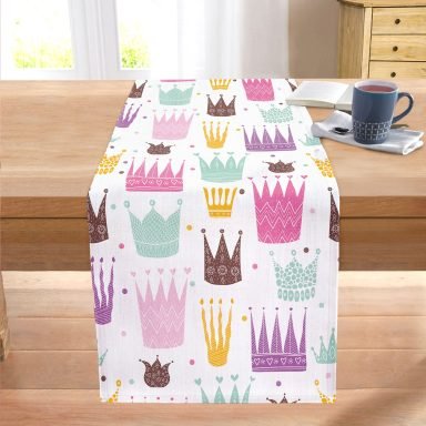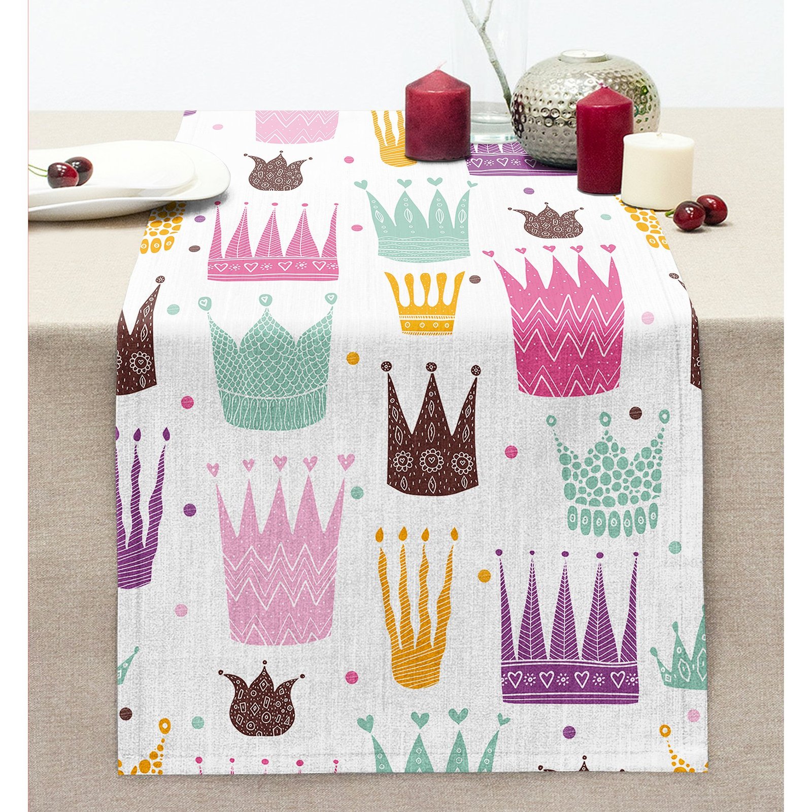 Rengarenk Kral Kraliçe Tacı Figürlü Dijital Baskılı Özel Tasarım Modern Dikişli Şönil Runner