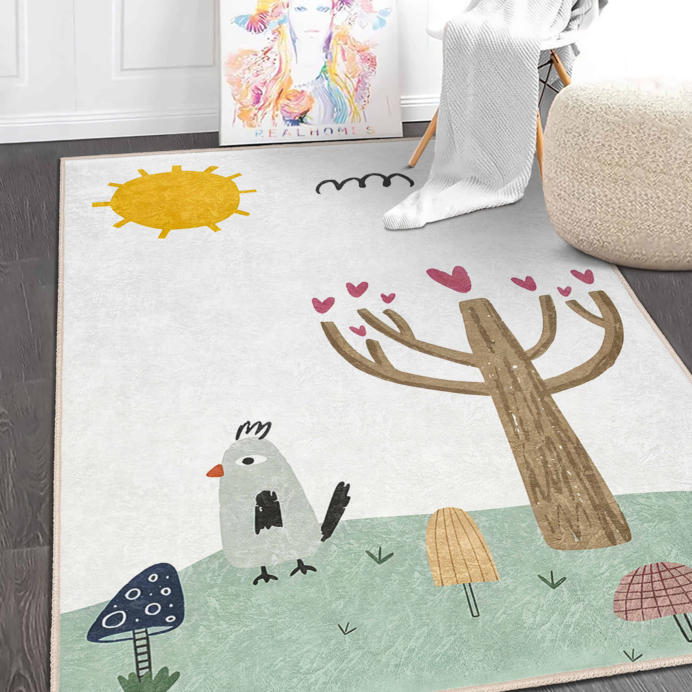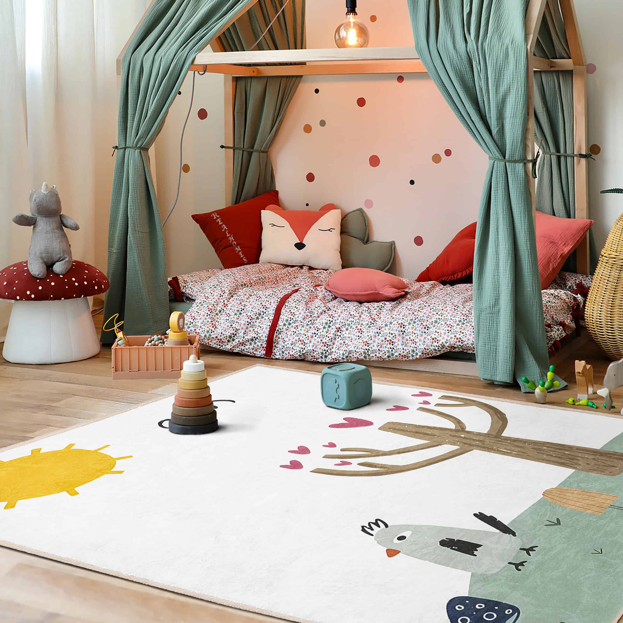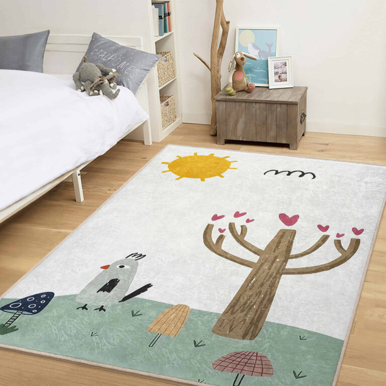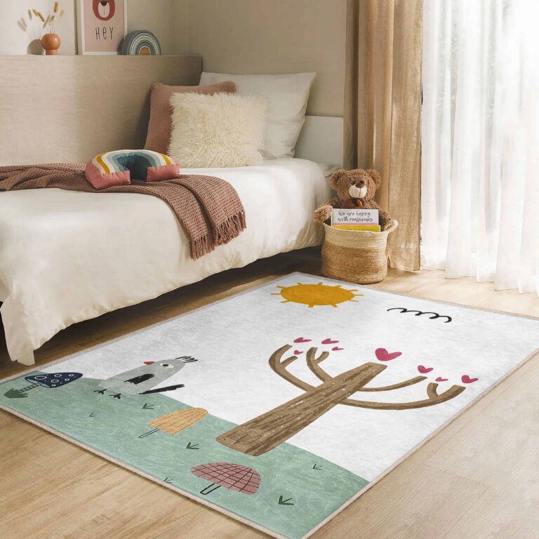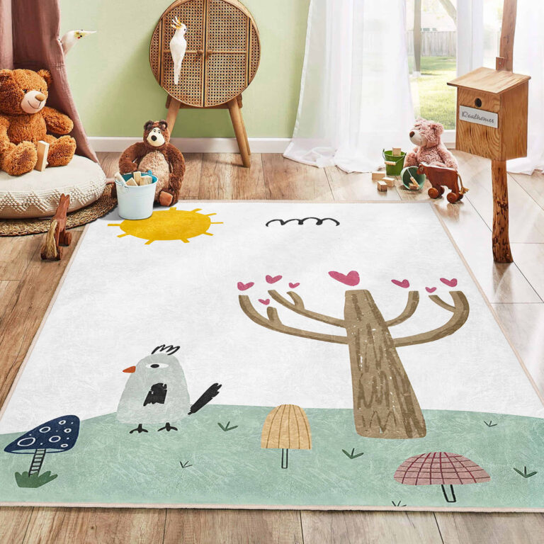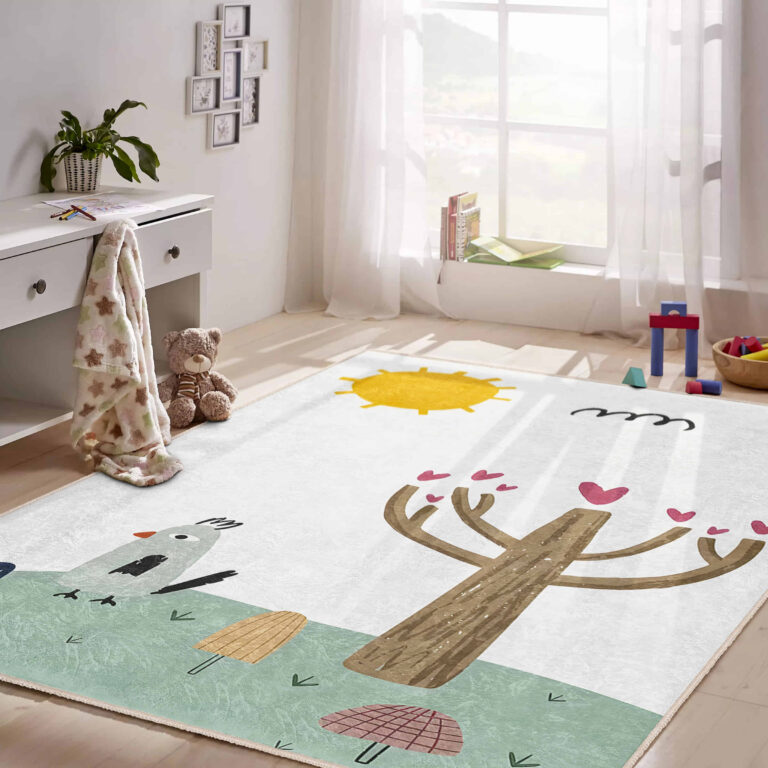 Renkli Ağaçlar ve Hayvanlar Desenli Neşeli Çocuk Halısı – Kaymaz Tabanlı Makinede Yıkanabilir Halı