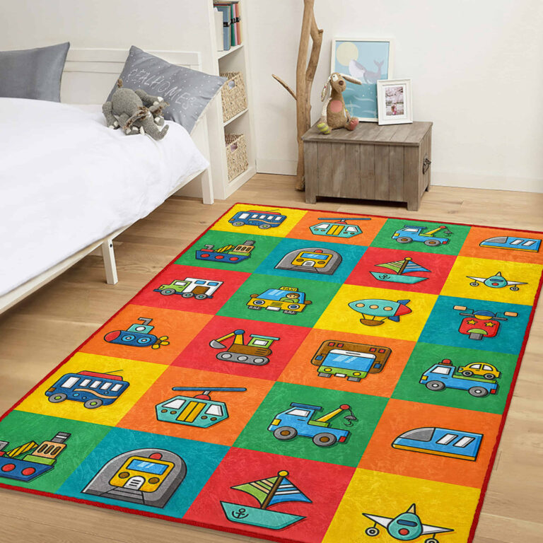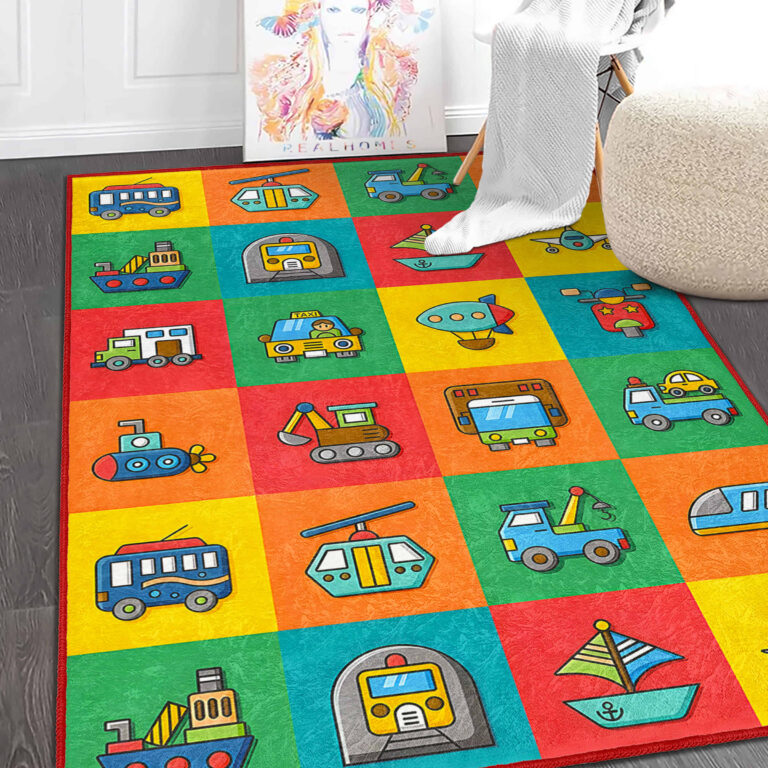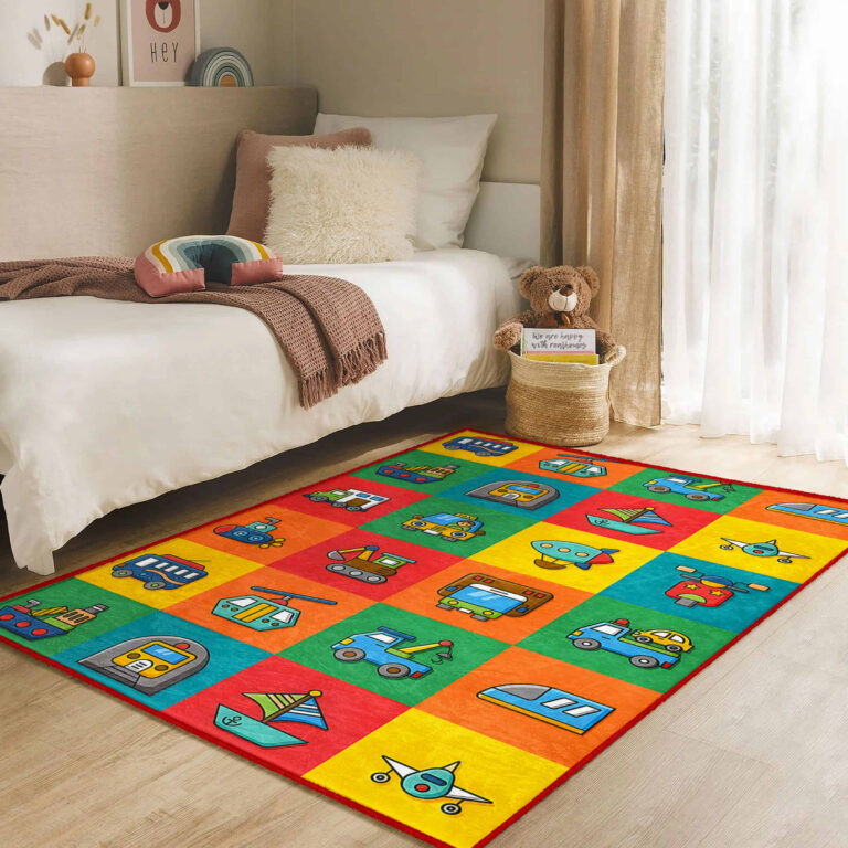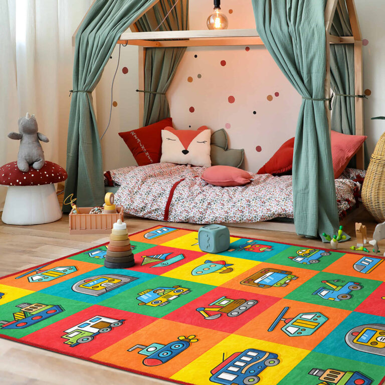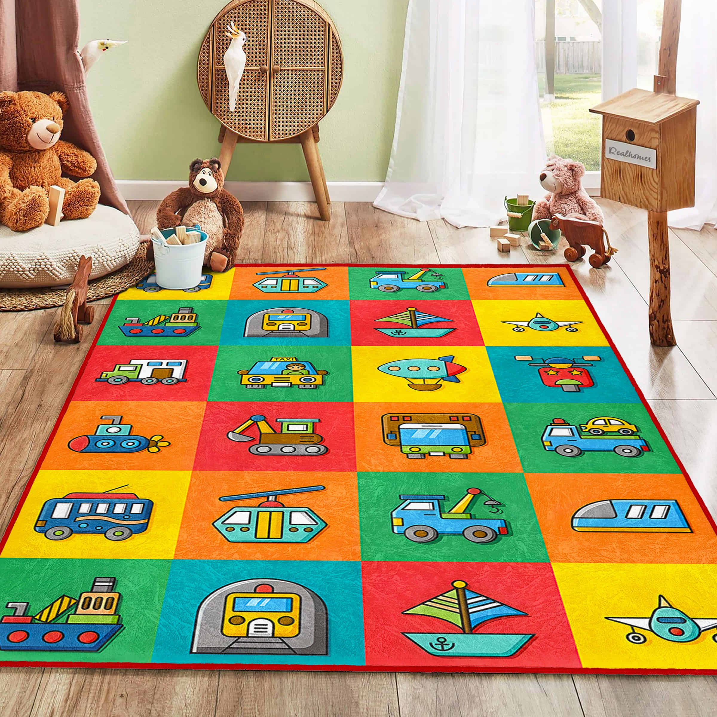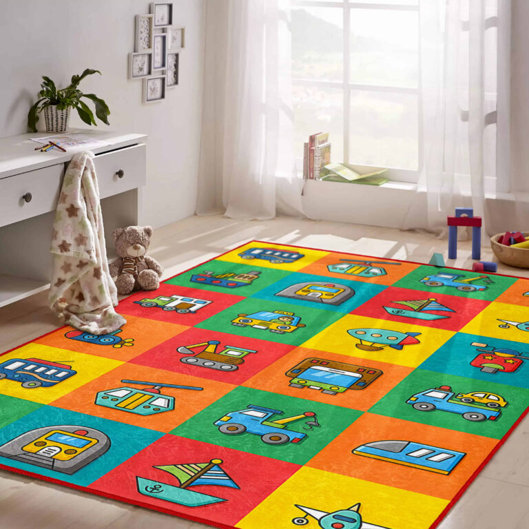 Renkli Araç Desenli Çocuk Halısı – Makinede Yıkanabilir Kaymaz Tabanlı Dikdörtgen Halı