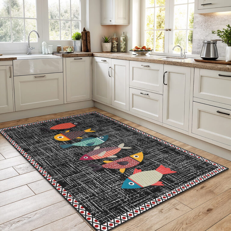 Renkli Balık Desenli Mutfak Halısı – Makinede Yıkanabilir Kaymaz Tabanlı Dikdörtgen Halı