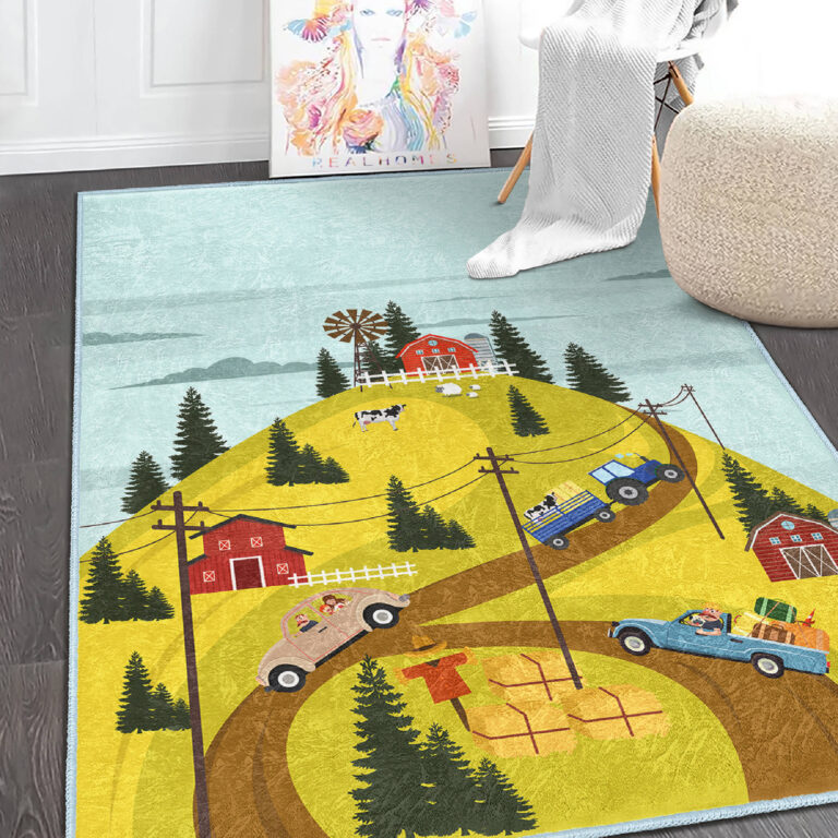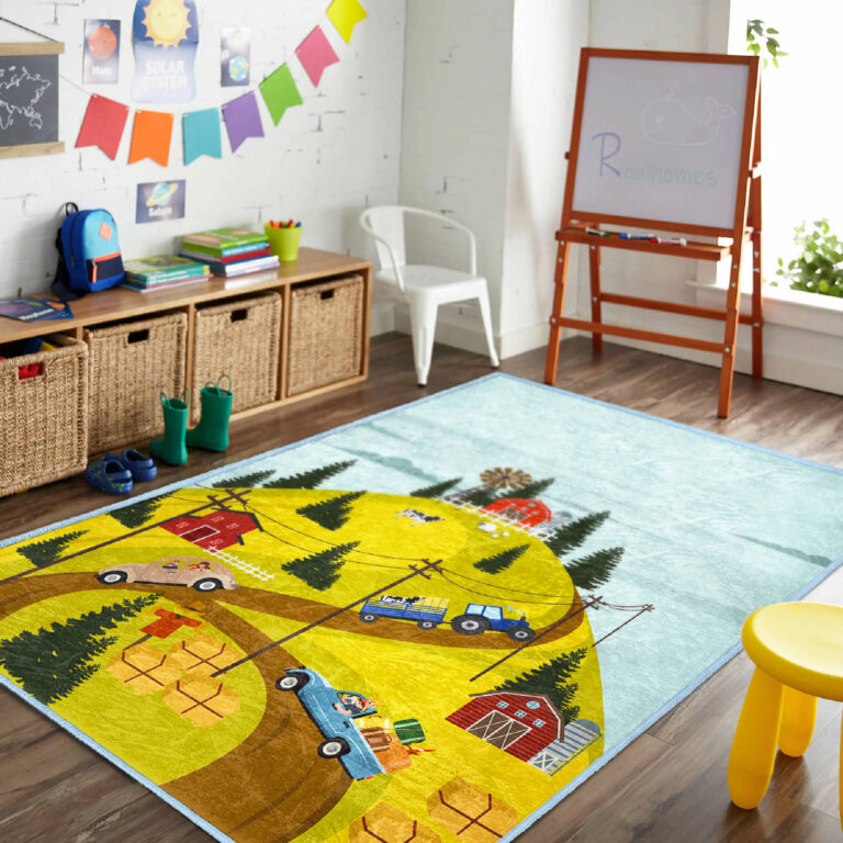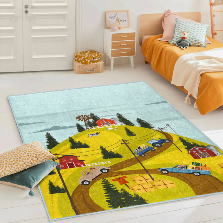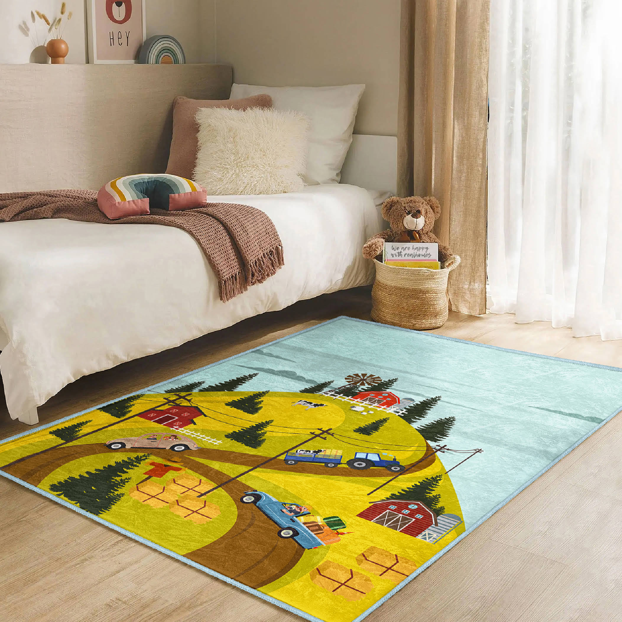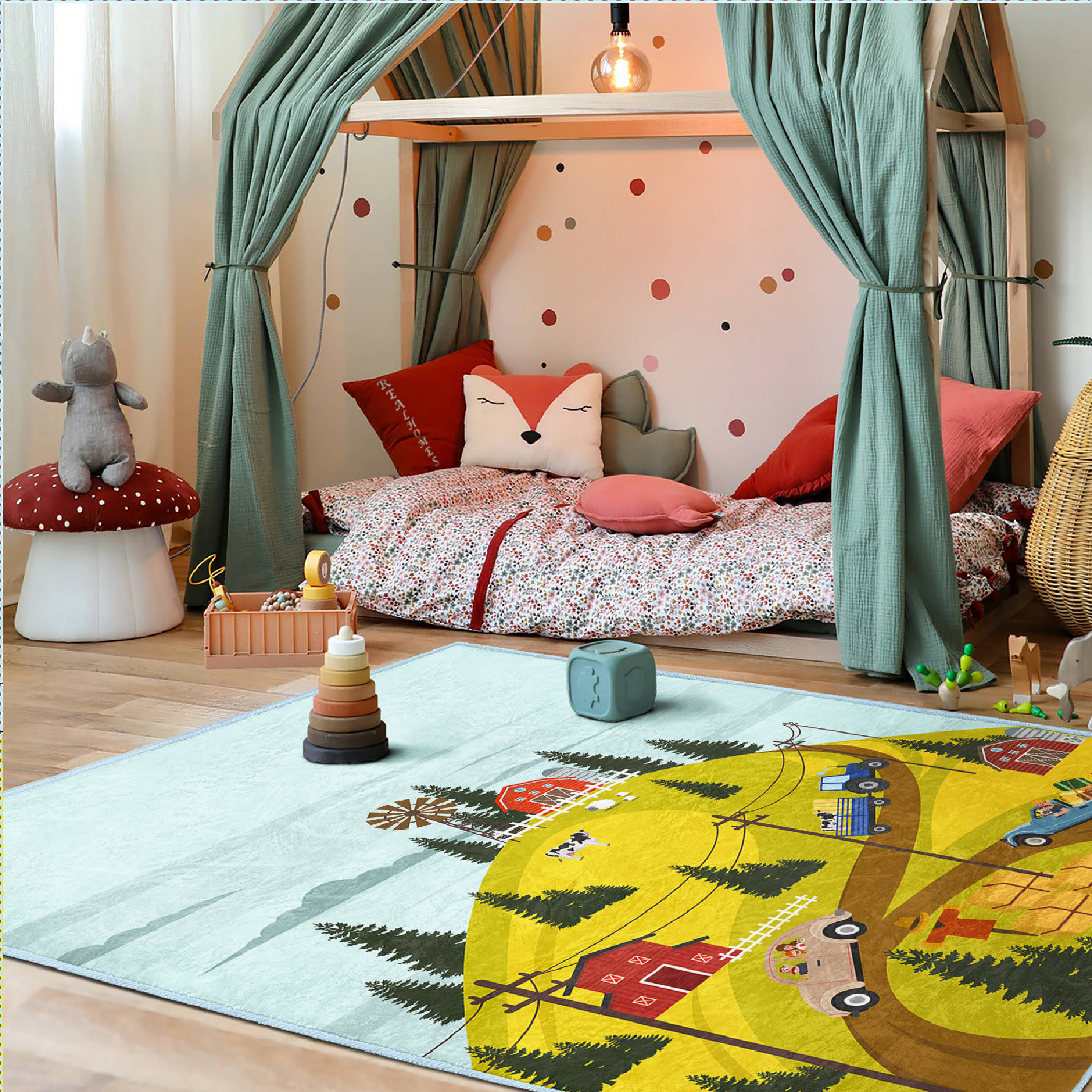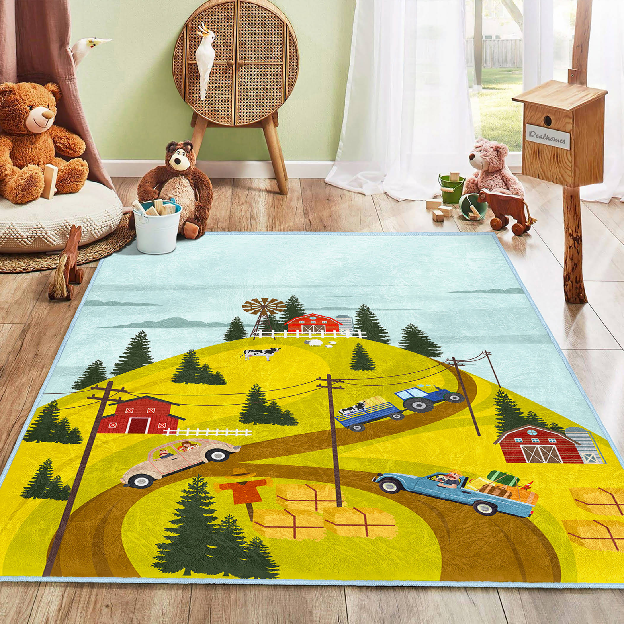 Renkli Çiftlik Temalı Yıkanabilir Kaymaz Taban Çocuk Halısı – Dikdörtgen Oda Dekoru