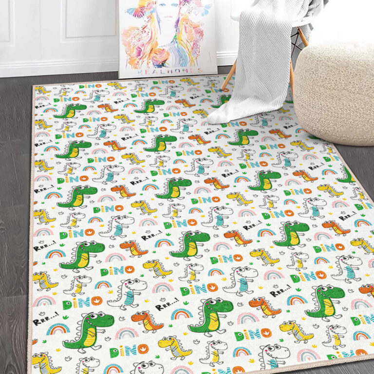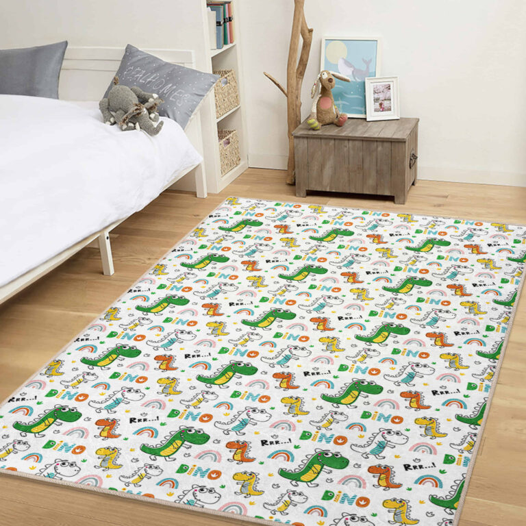 Renkli Dinozor Desenli Çocuk Halısı – Yıkanabilir ve Kaymaz Tabanlı Dikdörtgen Halı