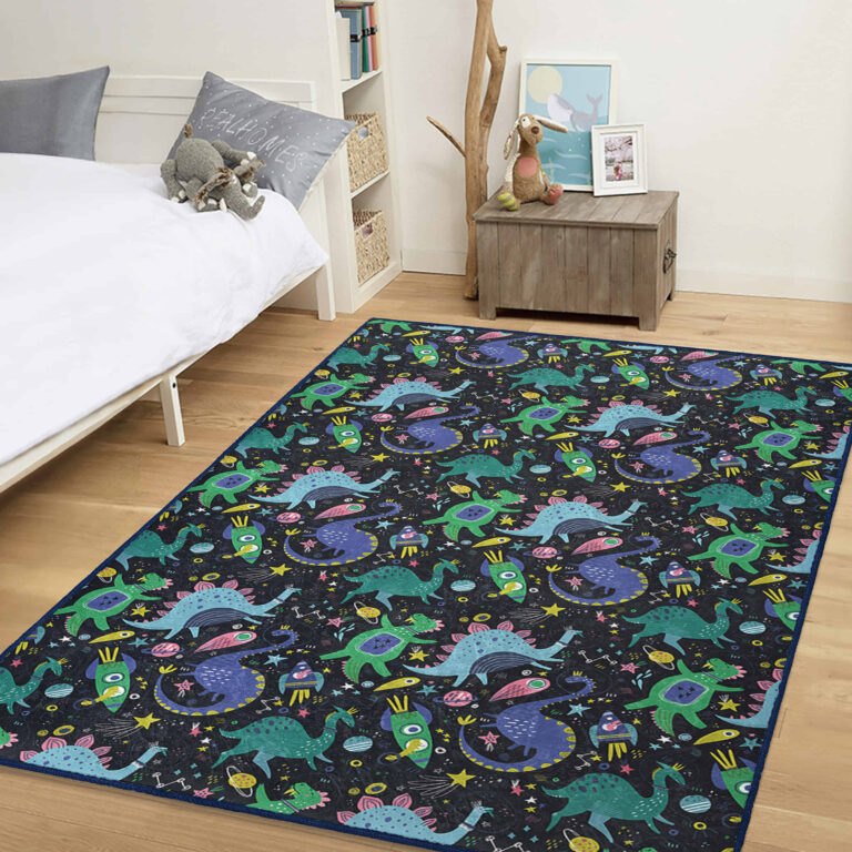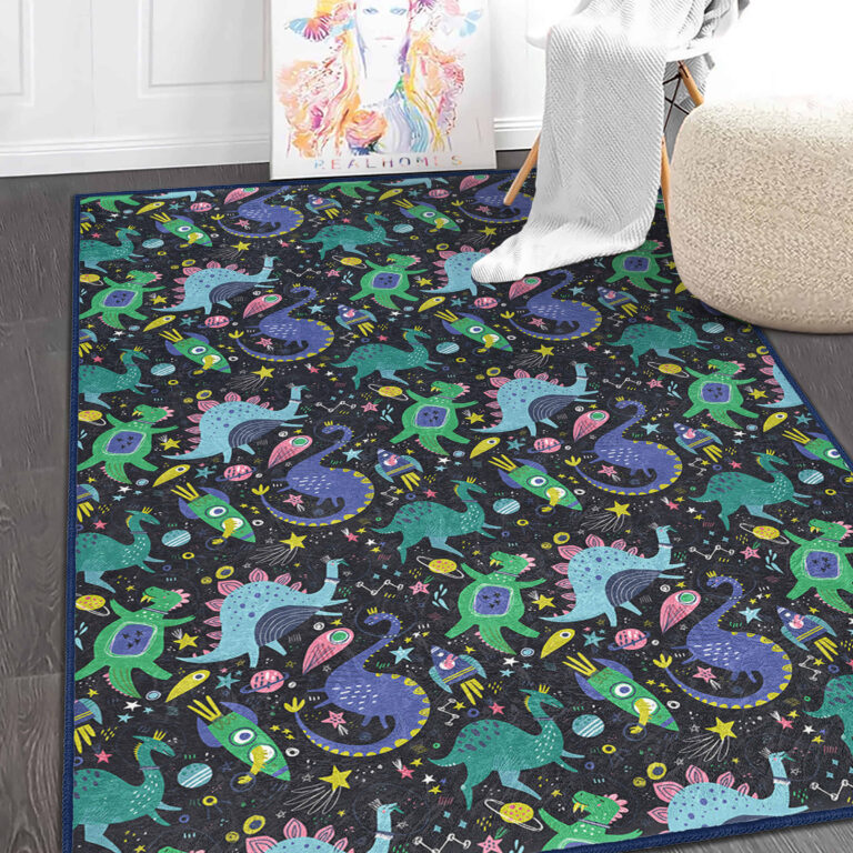 Renkli Dinozor Desenli Dikdörtgen Çocuk Halısı – Makinede Yıkanabilir Kaymaz Tabanlı Halı