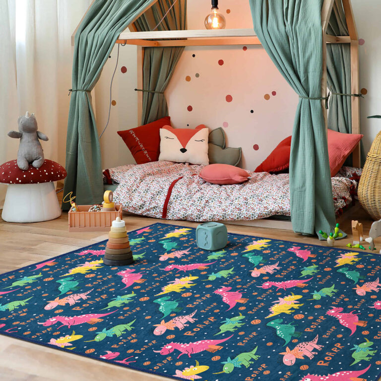 Renkli Dinozor Motifli Çocuk Halısı – Eğlenceli ve Yıkanabilir Kaymaz Taban Halı