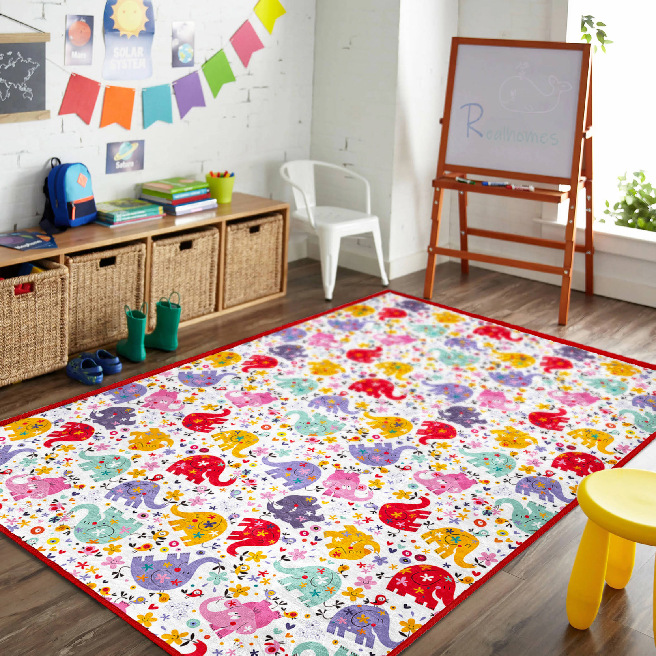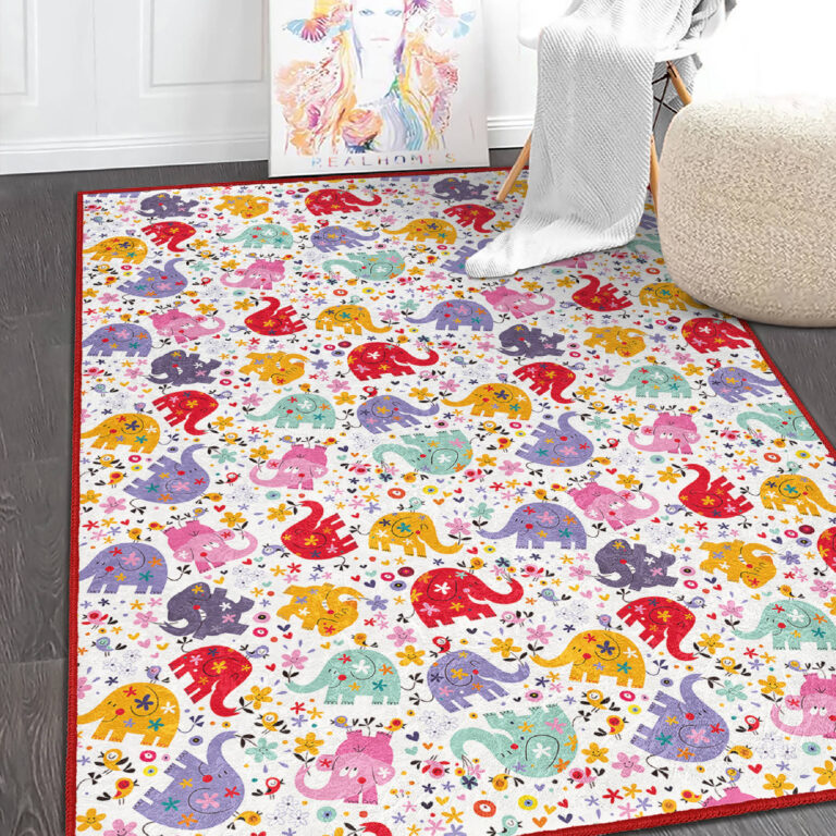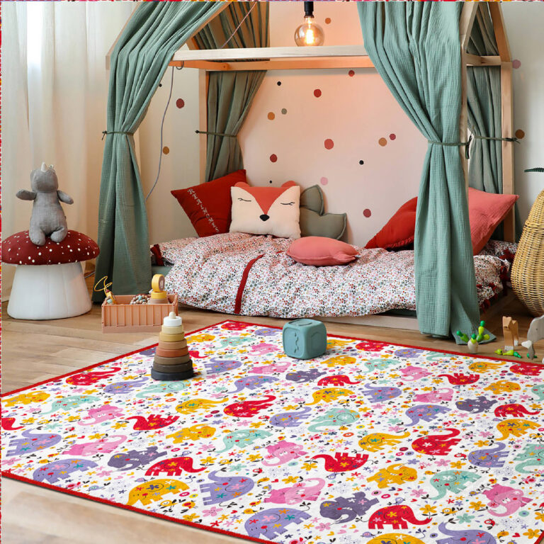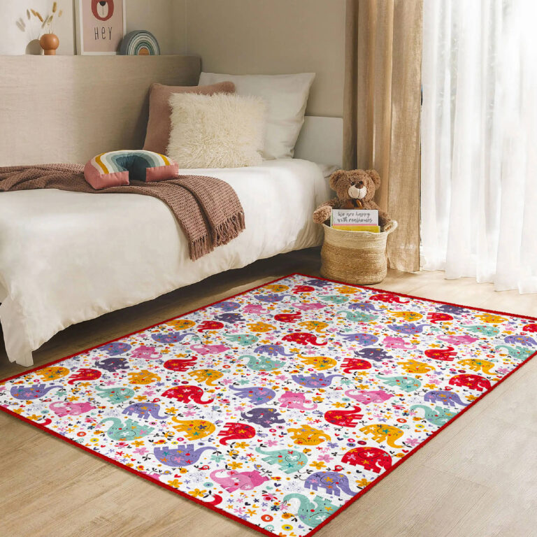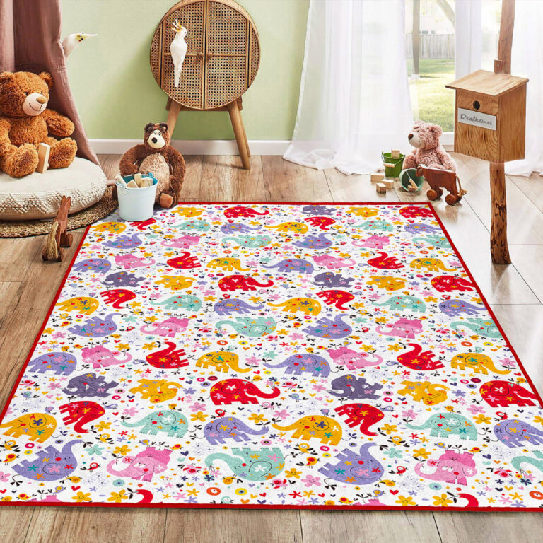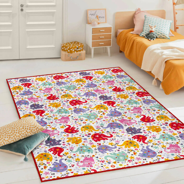 Renkli Fil Desenli Yıkanabilir Kaymaz Taban Çocuk Halısı – 3D Dijital Baskı İle Eğlenceli Tasarım