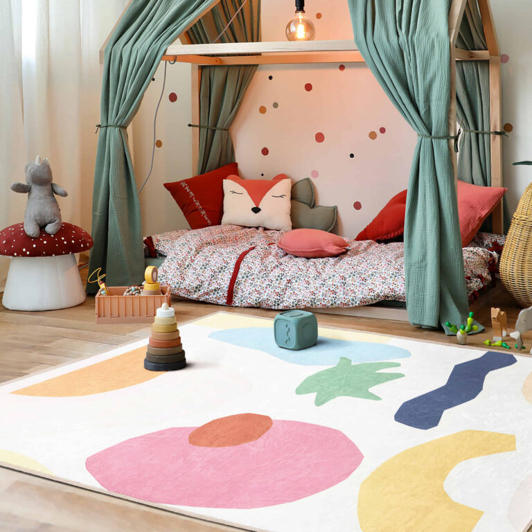 Renkli Geometrik Desenli Dikdörtgen Çocuk Halısı – Makinede Yıkanabilir Kaymaz Tabanlı