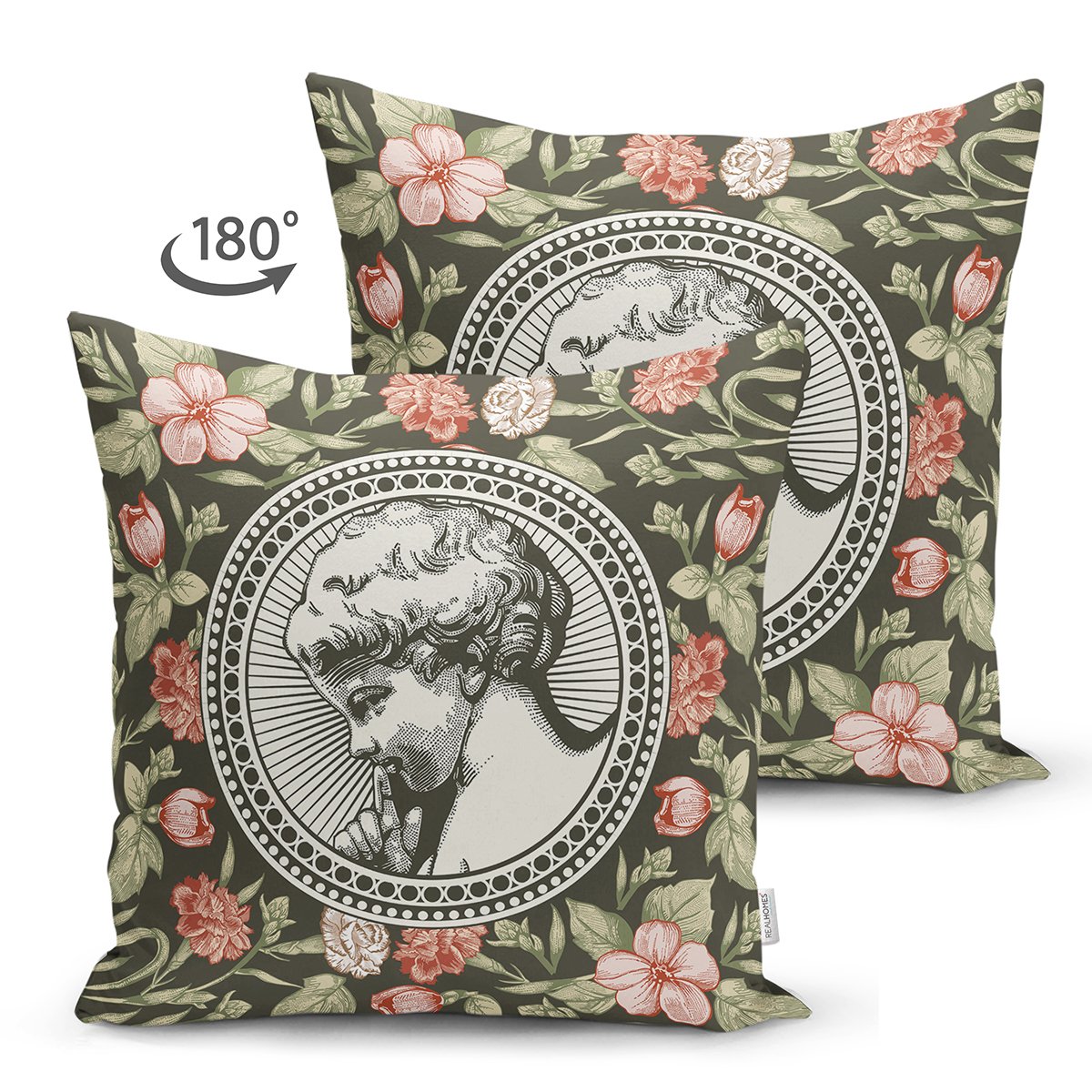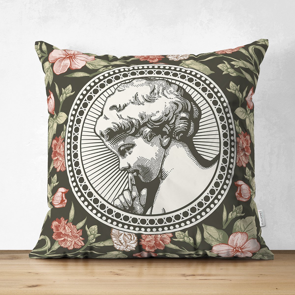Renkli Gül & Portre Motifli Dijital Baskılı Dekoratif Süet Yastık Kırlent Kılıfı