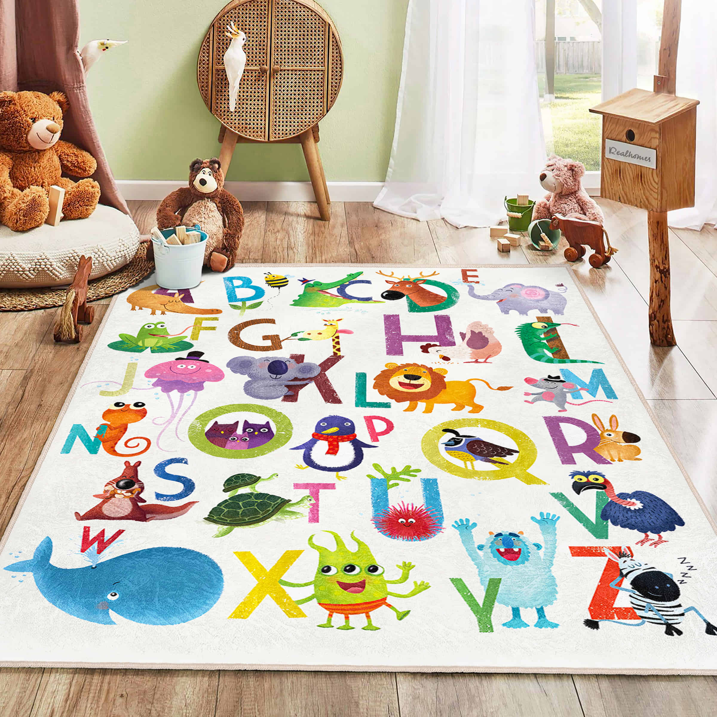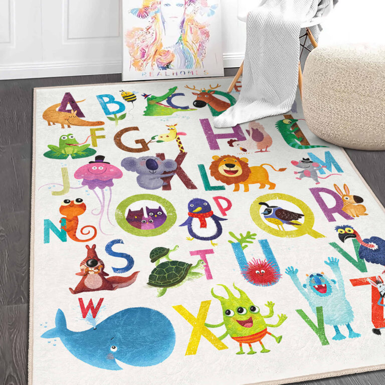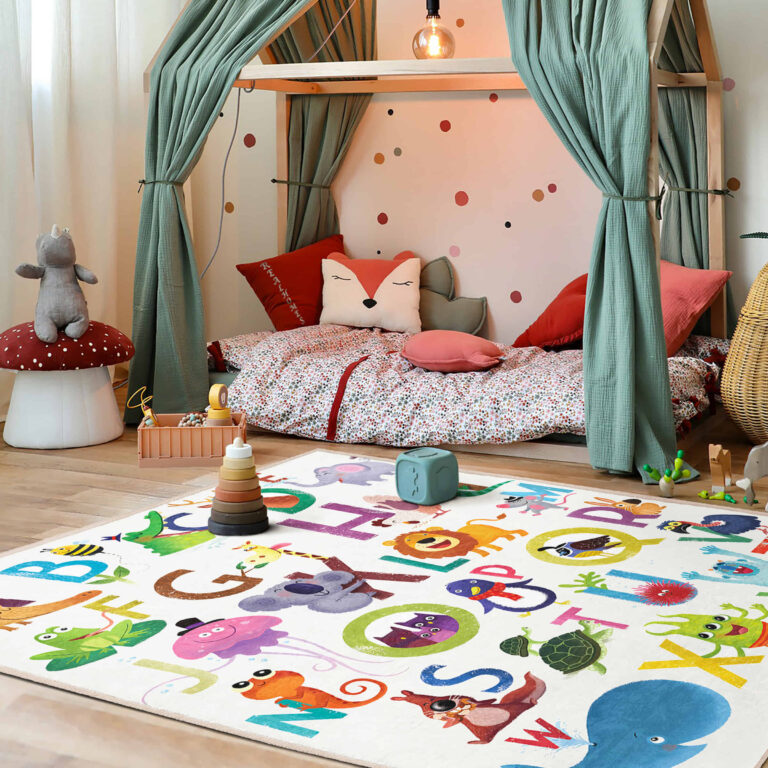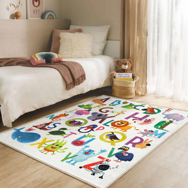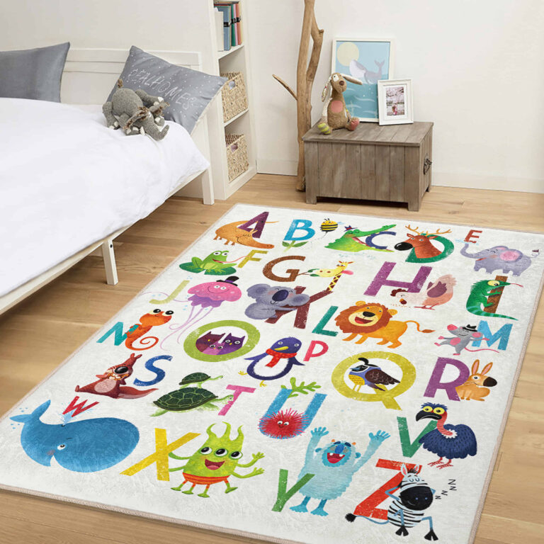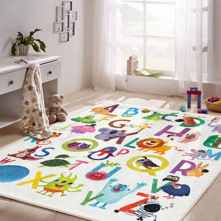 Renkli Hayvanlar ve Harf Desenli Yıkanabilir Kaymaz Taban Çocuk Halısı – Dikdörtgen Modeli