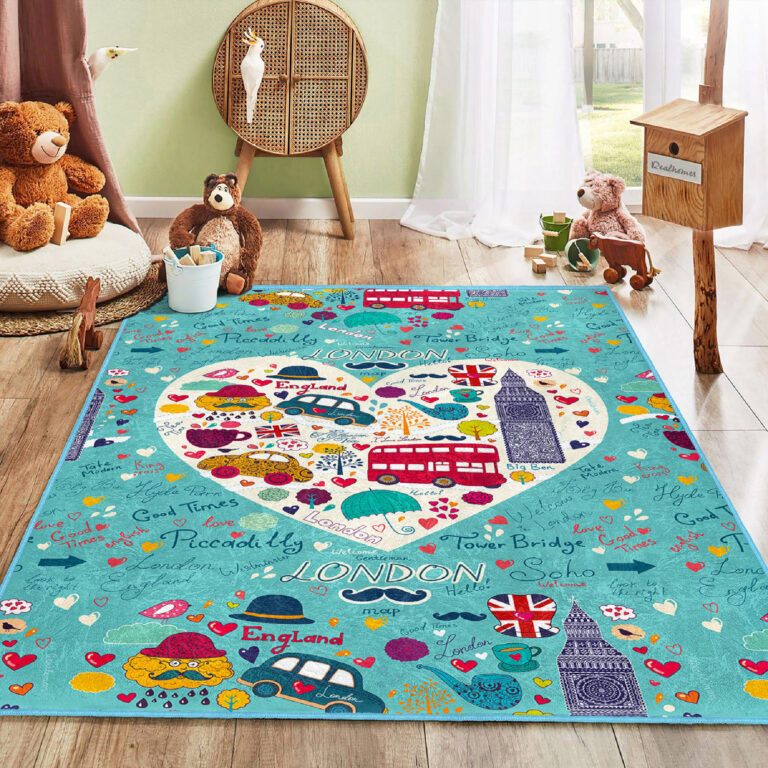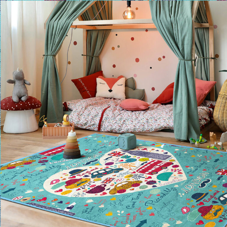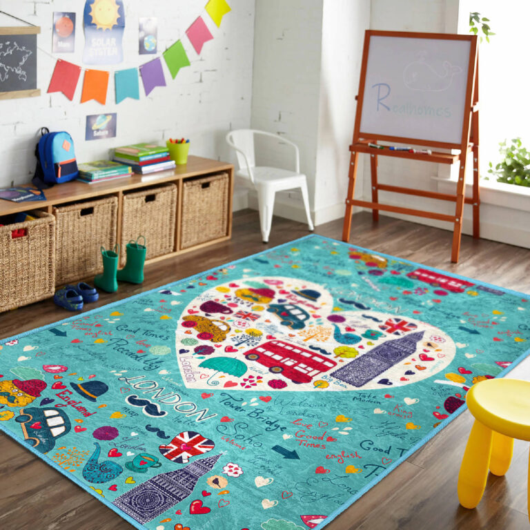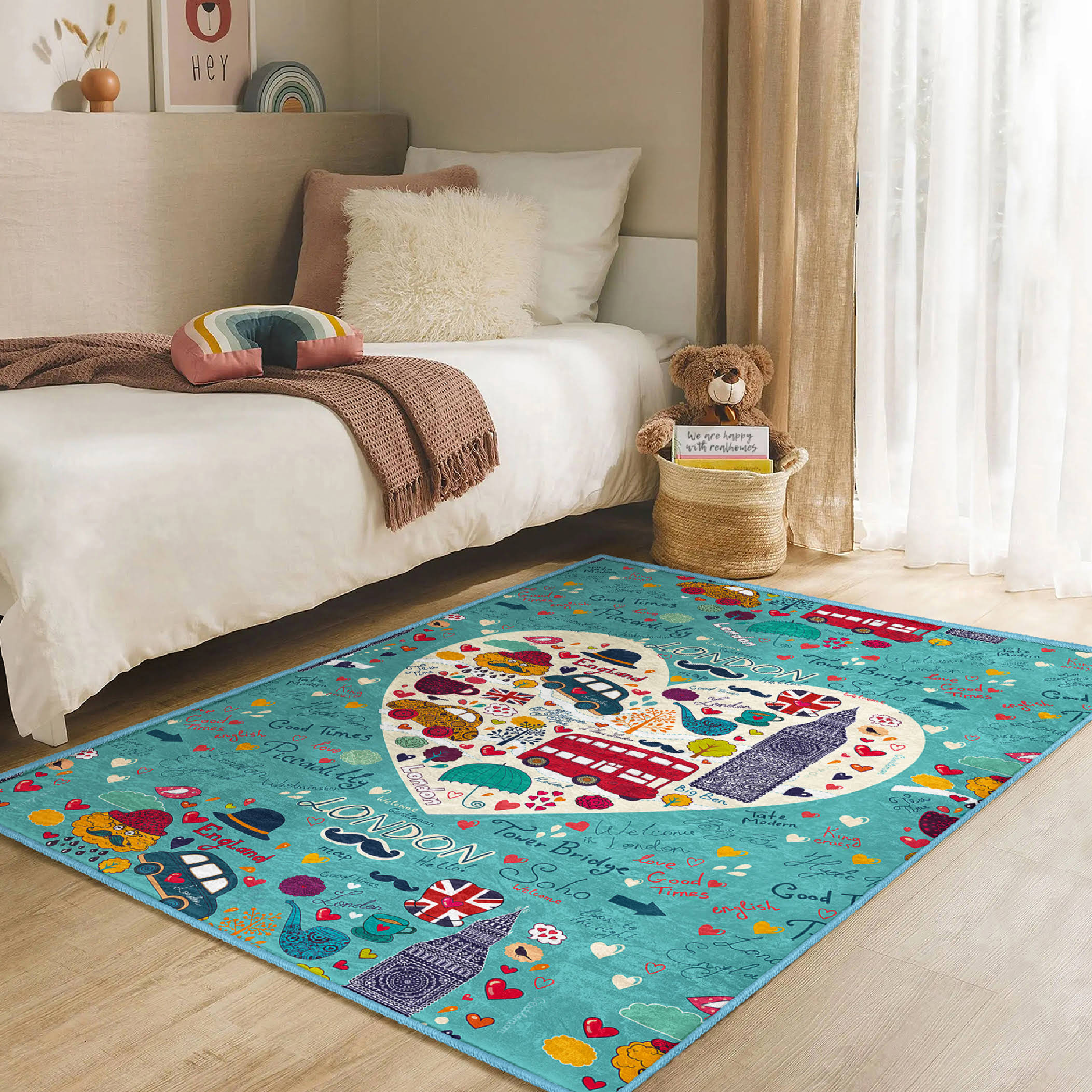 Renkli Londra Temalı Sevimli Kalpler ve Otobüs Desenli Yıkanabilir Çocuk Halısı