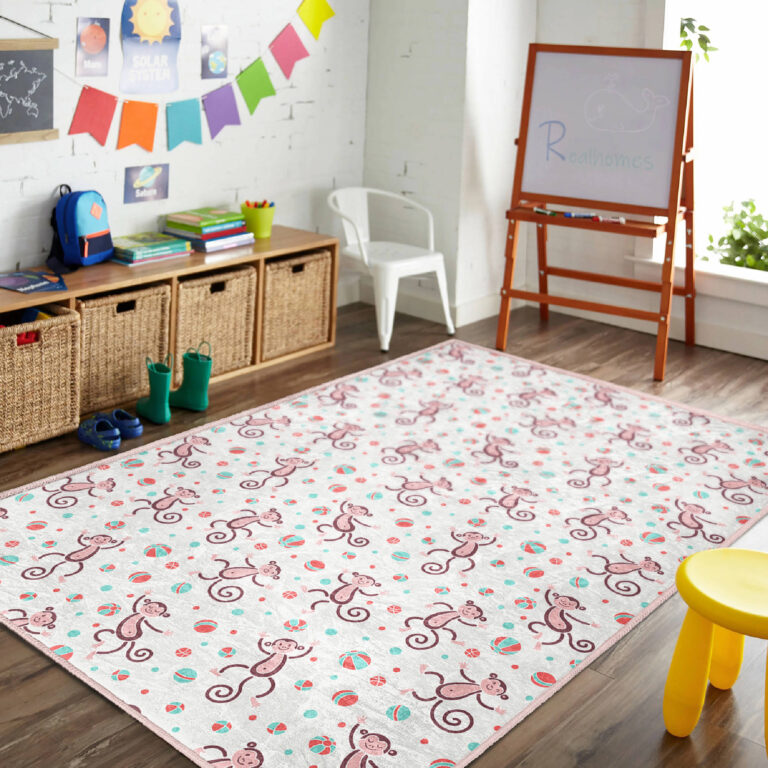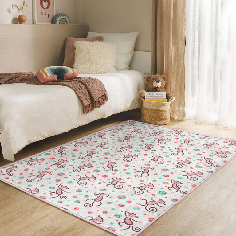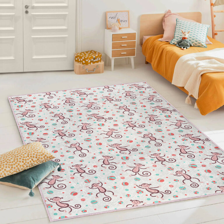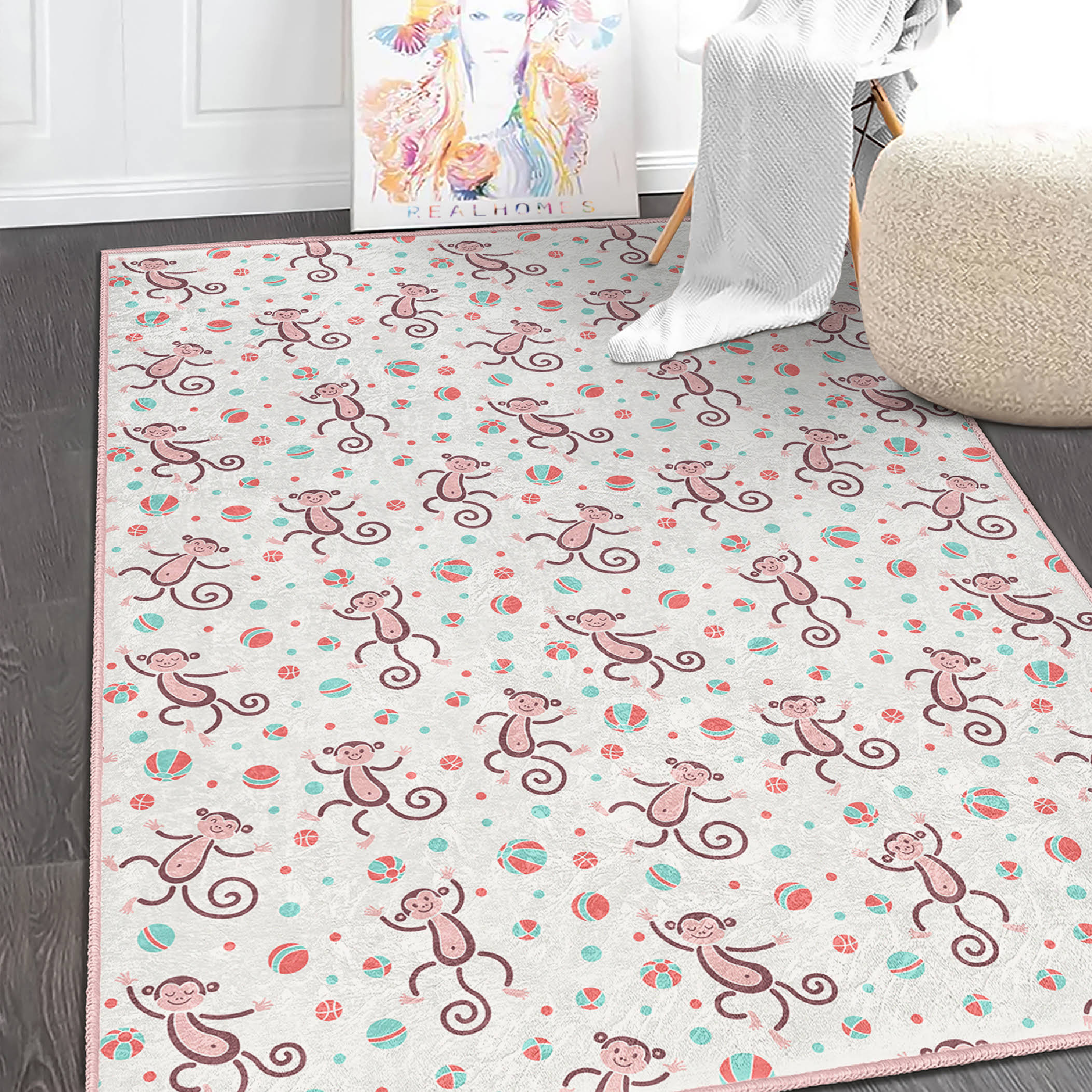 Renkli Maymun Desenli Dikdörtgen Makinede Yıkanabilir Kaymaz Taban Çocuk Halısı
