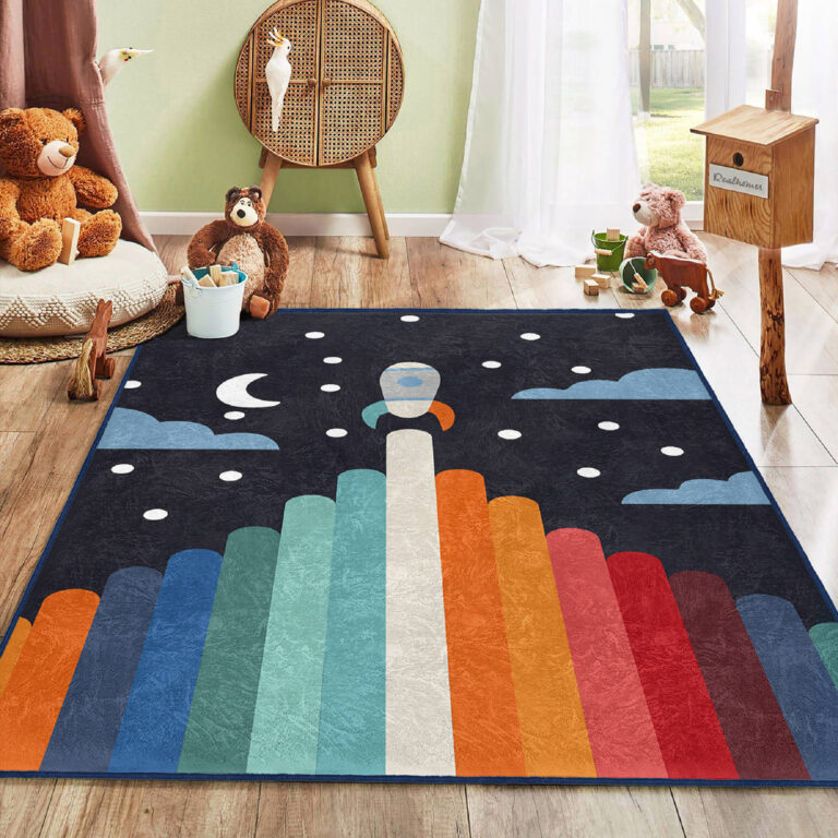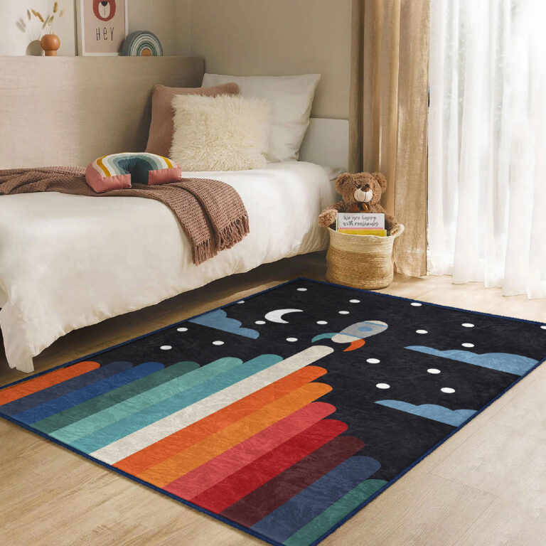 Renkli Roket ve Bulut Desenli Çocuk Halısı – Kaymaz Tabanlı Yıkanabilir Dikdörtgen Halı