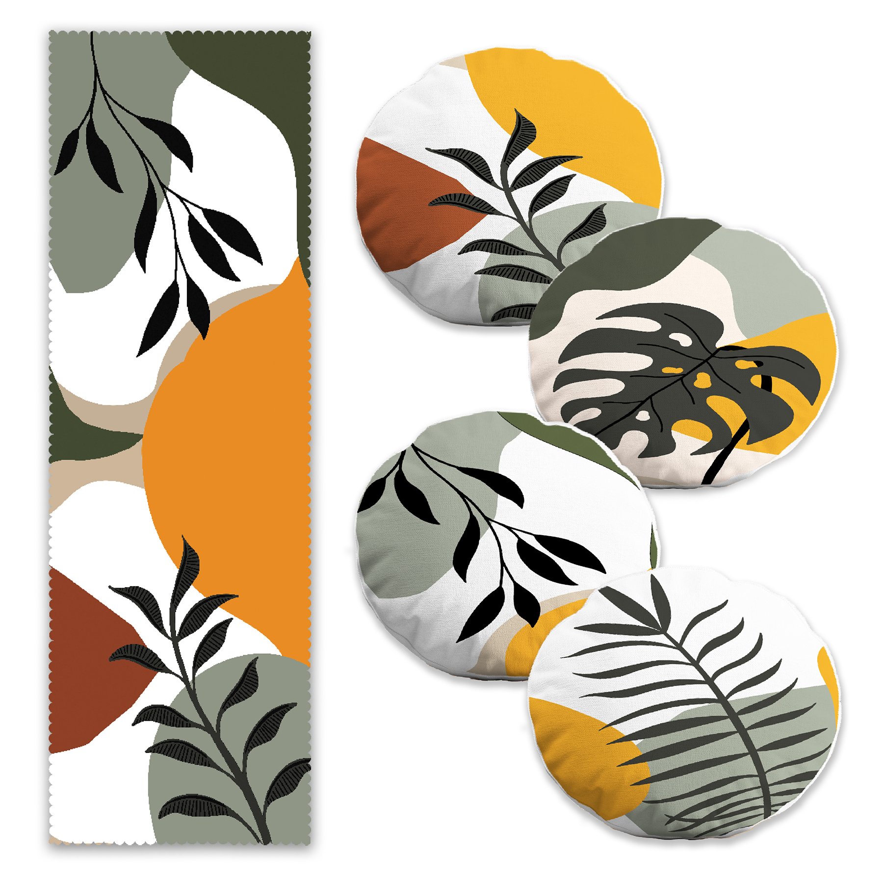 Renkli Soyut Renkli Tropik Yaprak Tasarımlı 4 Yuvarlak Kırlent Kılıfı ve 1 Runner Seti