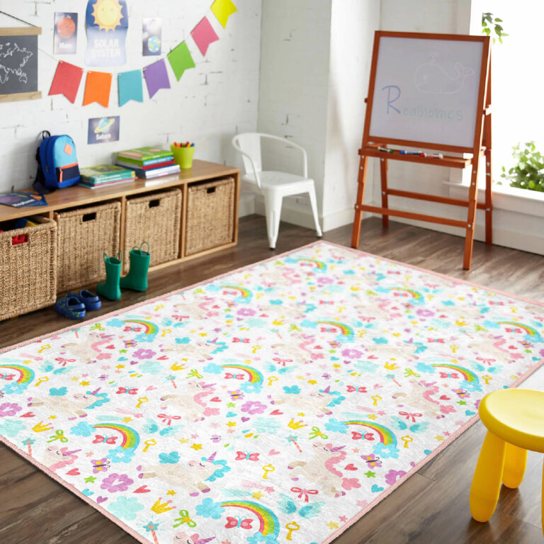 Renkli Tek Boynuzlu At ve Gökkuşağı Motifli Çocuk Halısı – Makinede Yıkanabilir Kaymaz Tabanlı