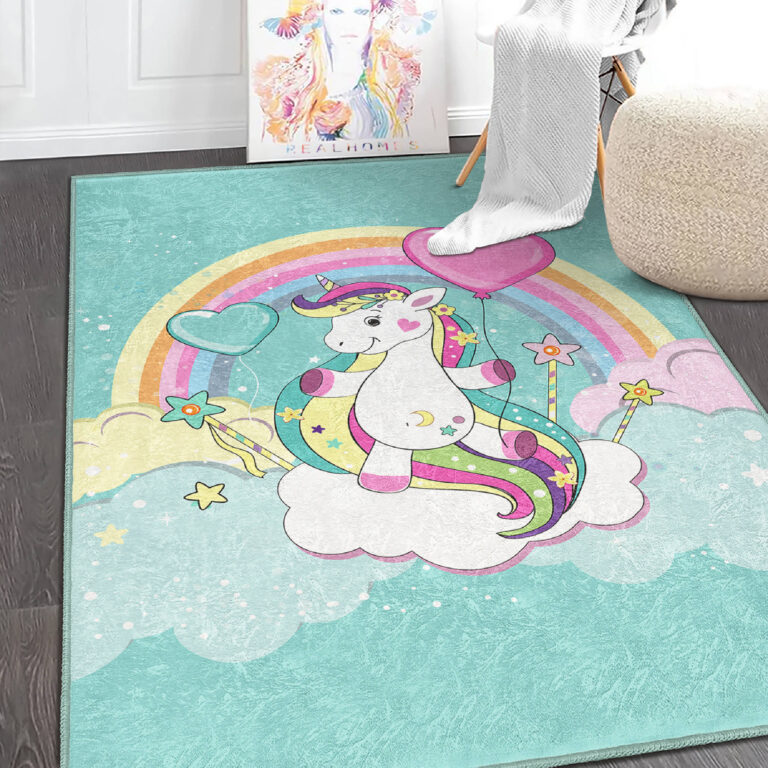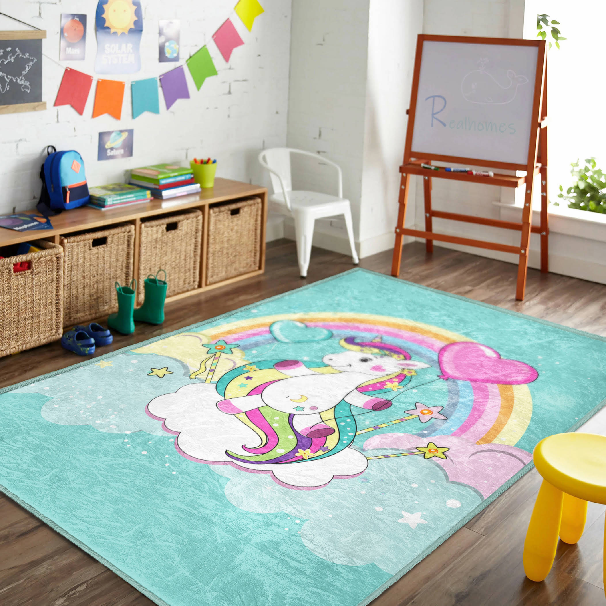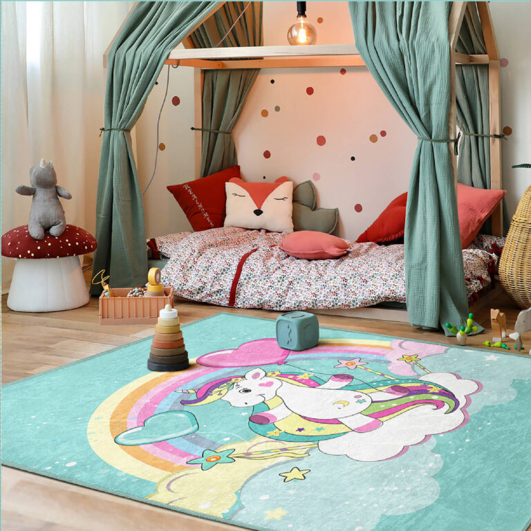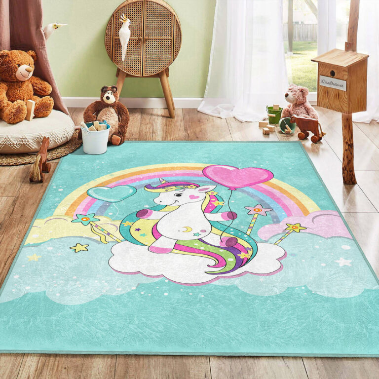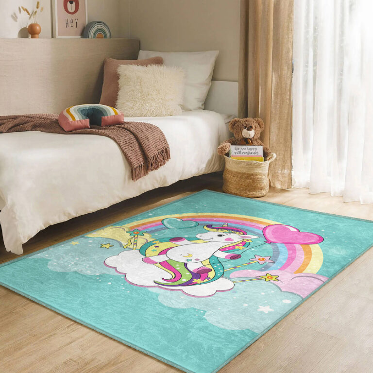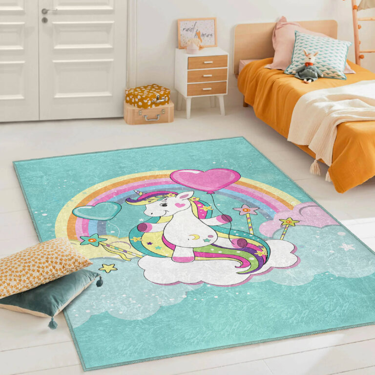 Renkli Tekboynuz Motifli Çocuk Halısı – Yıkanabilir Kaymaz Tabanlı Dikdörtgen Çocuk Halısı