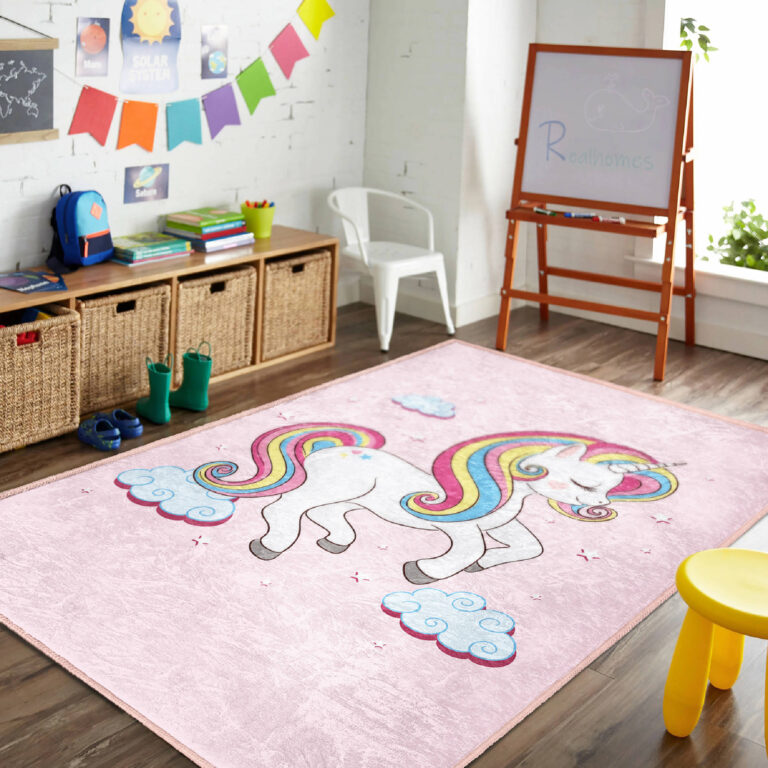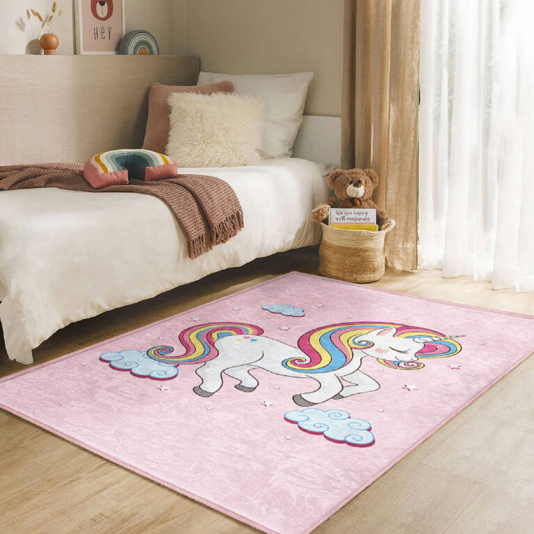 Renkli Unicorn Desenli Makinede Yıkanabilir Kaymaz Taban Çocuk Halısı – Dikdörtgen Çocuk Odası Halısı
