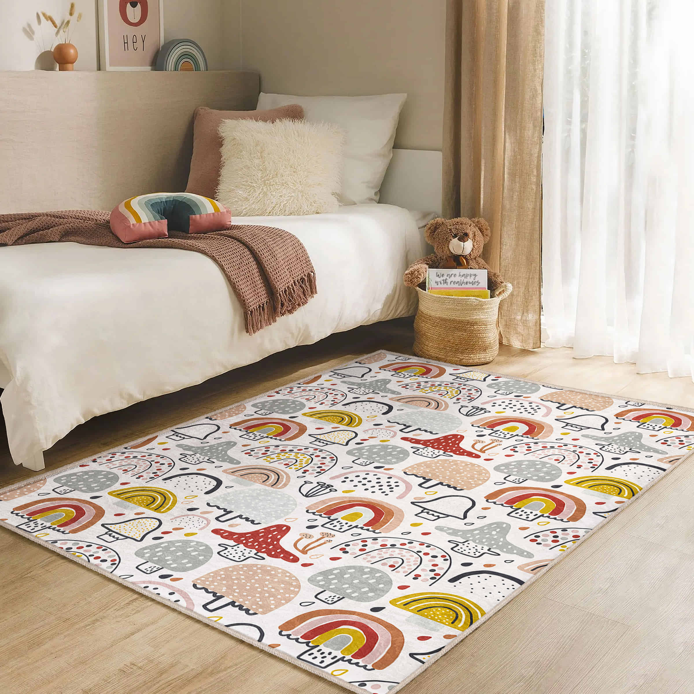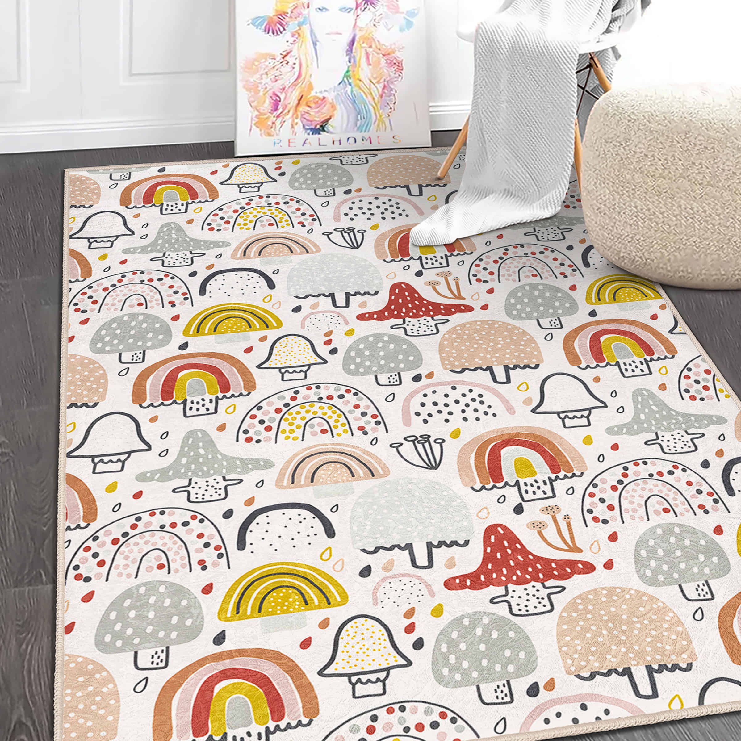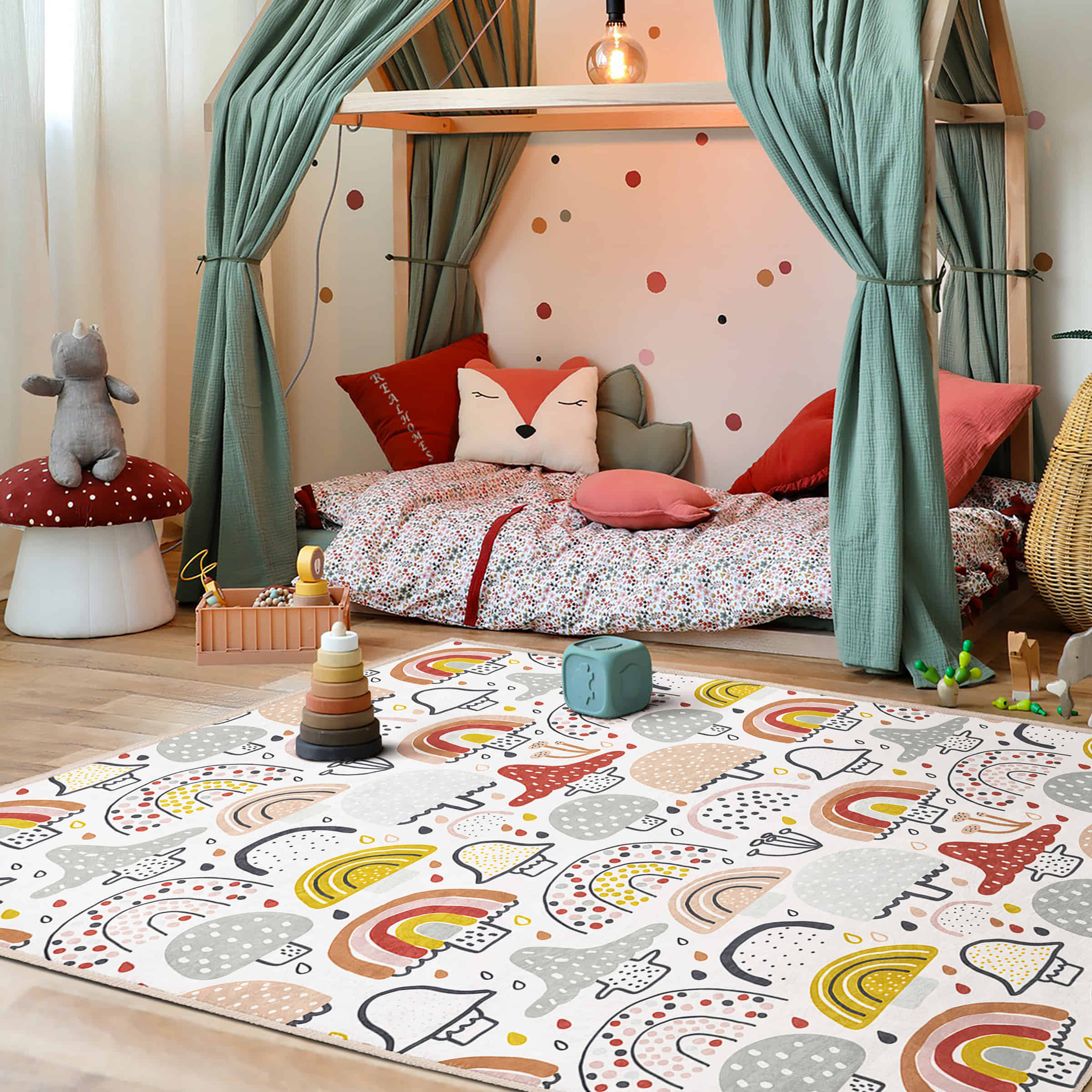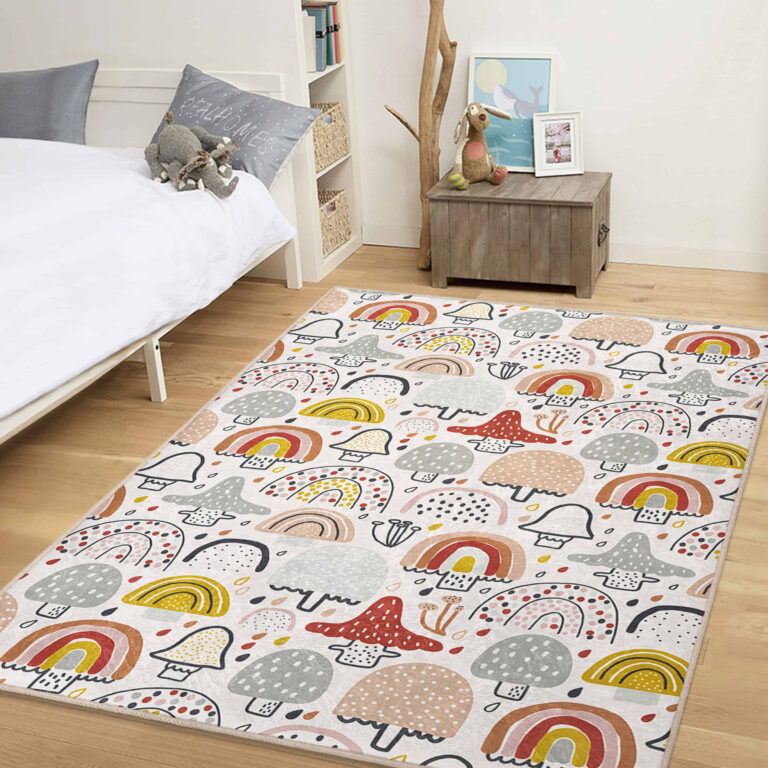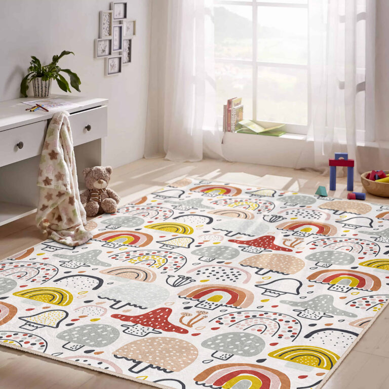 Renkli Yağmur Şemsiyesi ve Mantar Desenli Çocuk Halısı – Makinede Yıkanabilir Kaymaz Taban