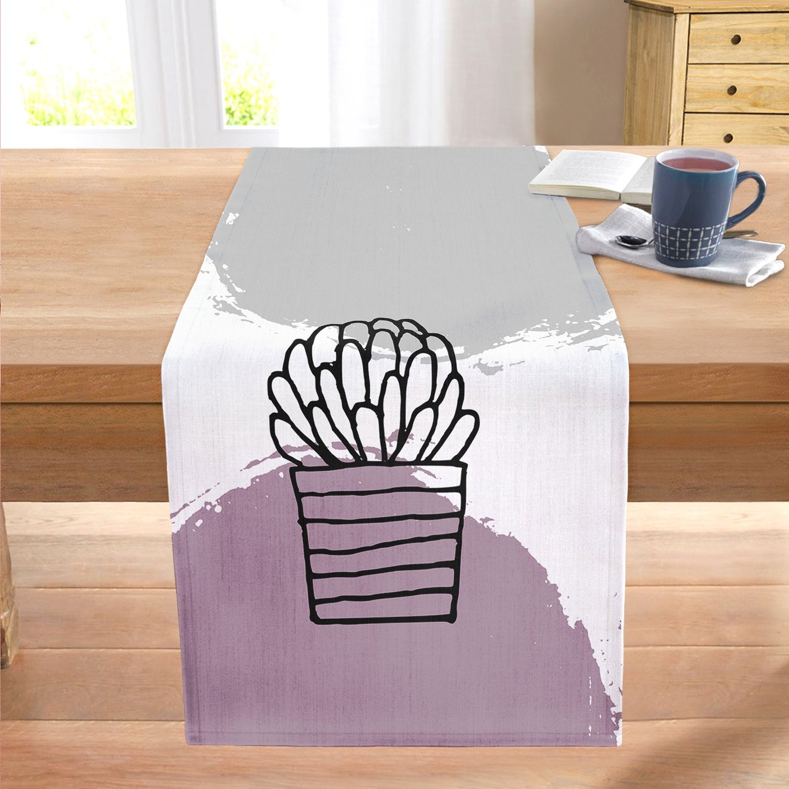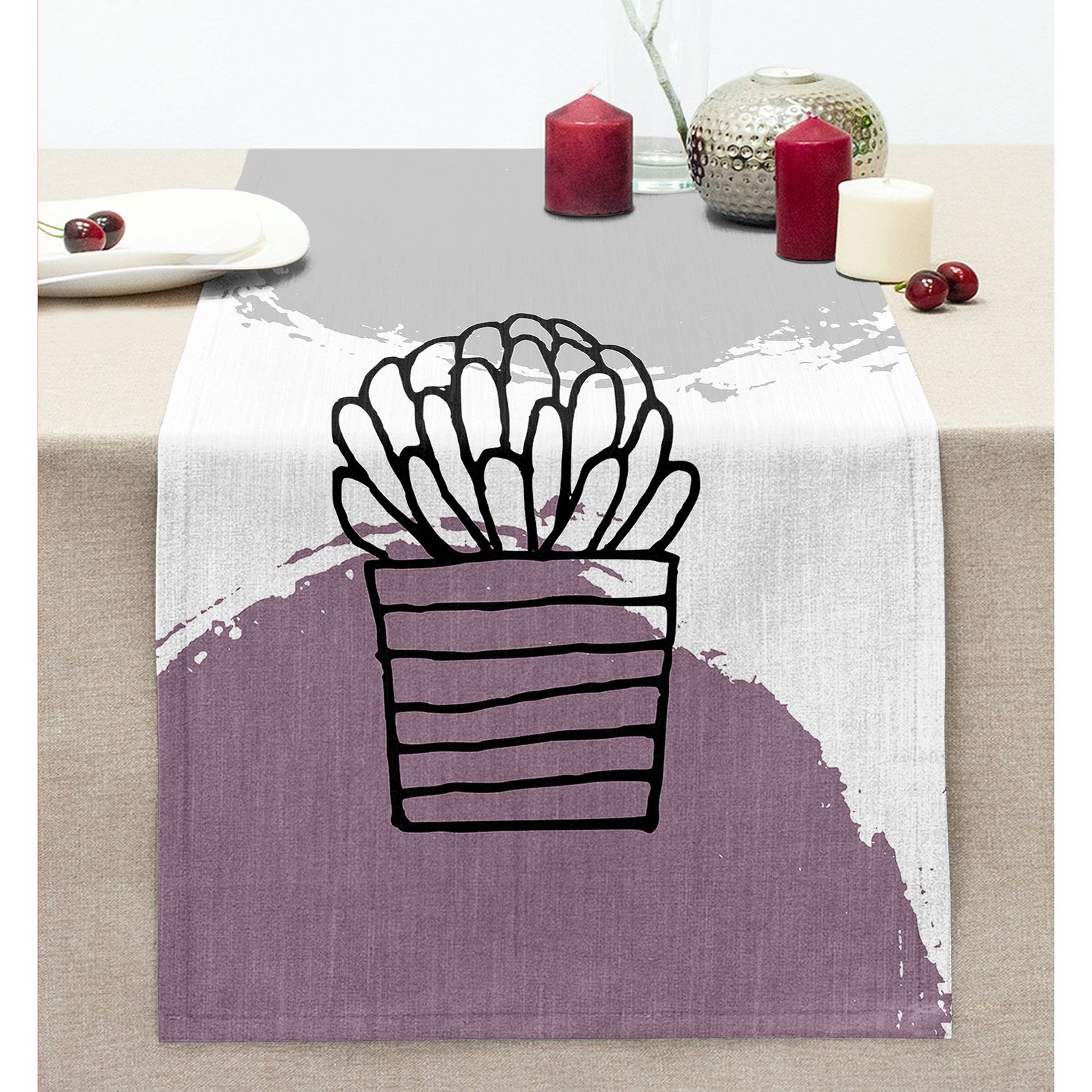 Renkli Zemin Kaktüs Tasarımlı Dijital Baskılı Modern Dikişli Şönil Runner