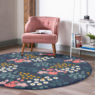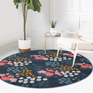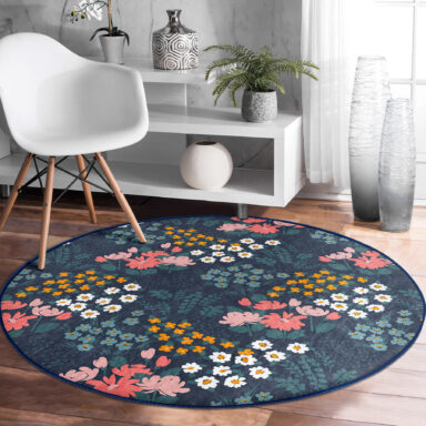 Renkli Zemin Onedraw Çizimli Çiçek Desenli Lacivert Salon Ve Oturma Odası Kaymaz Taban Yuvarlak Halı