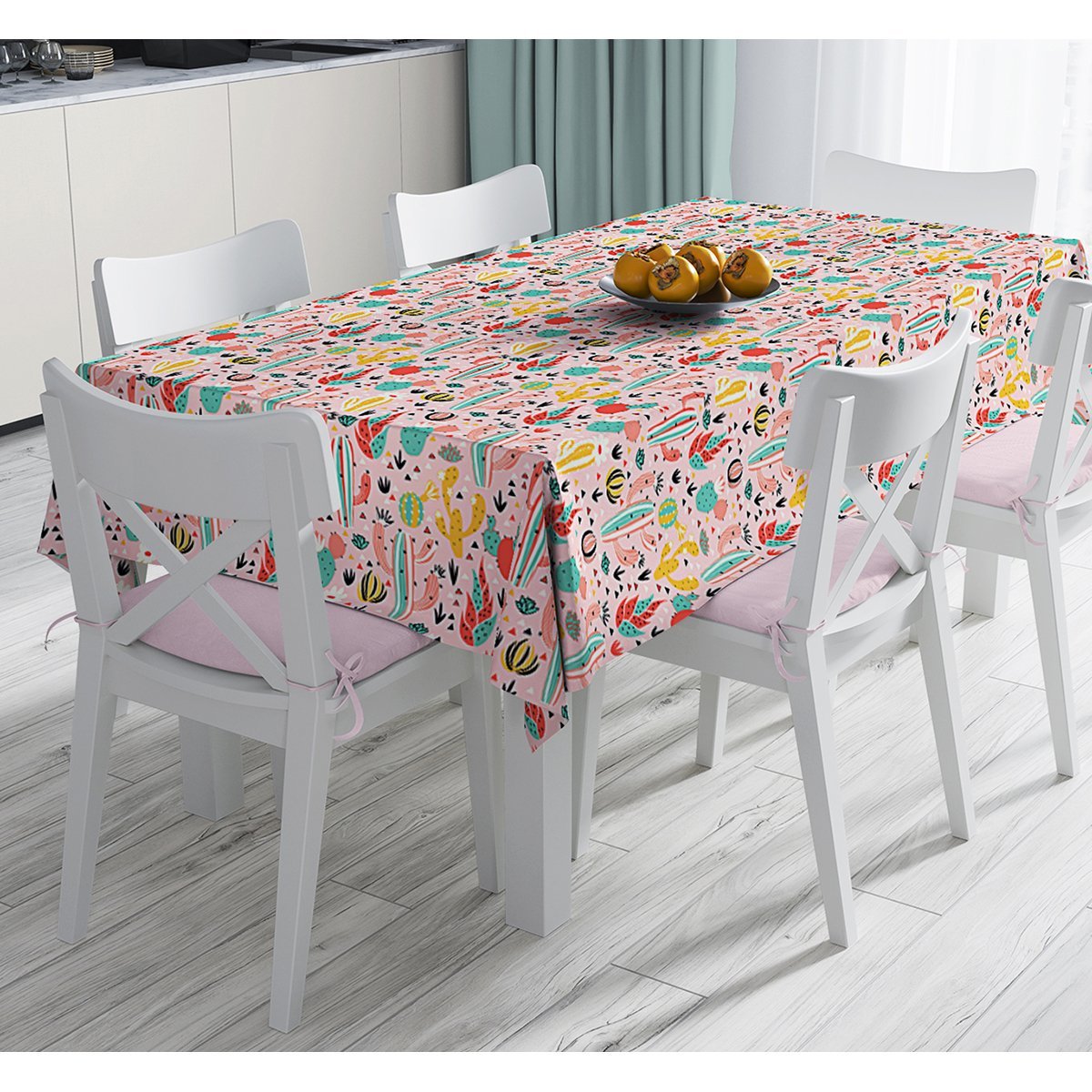 Renkli Zemin Üzerinde Kaktüs Desenli Dijital Baskılı Masa Örtüsü