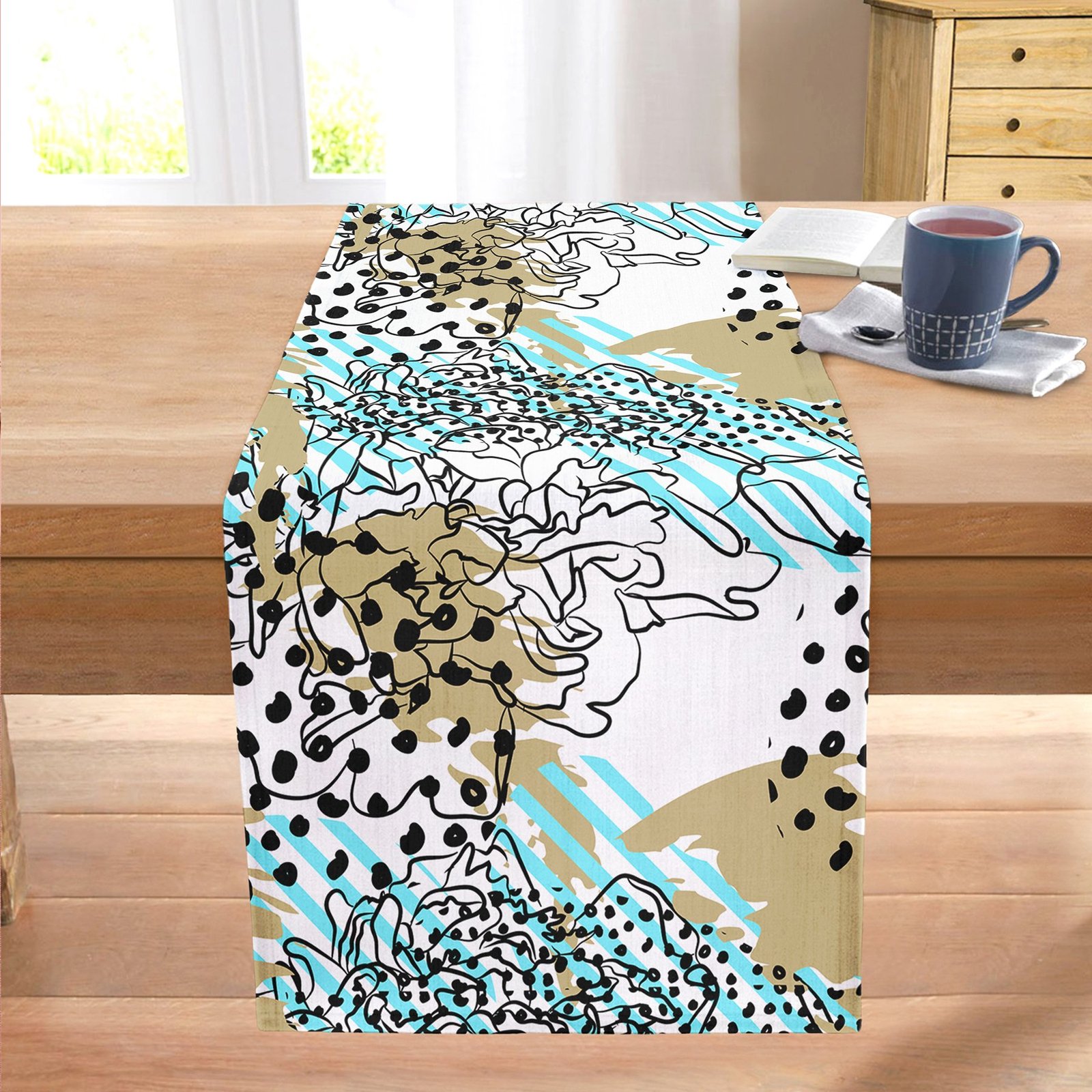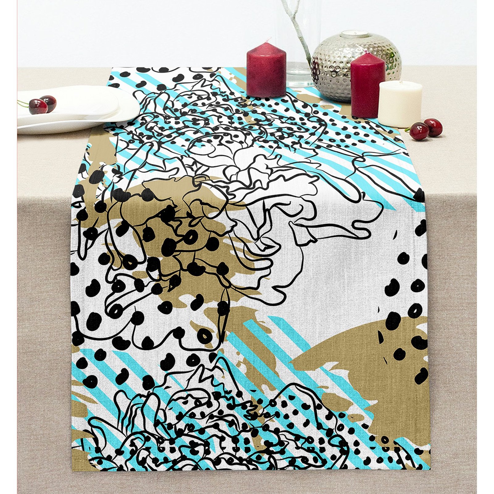 Renkli Zemin Üzerinde Onedraw Çizimli Dijital Baskılı Modern Dikişli Şönil Runner