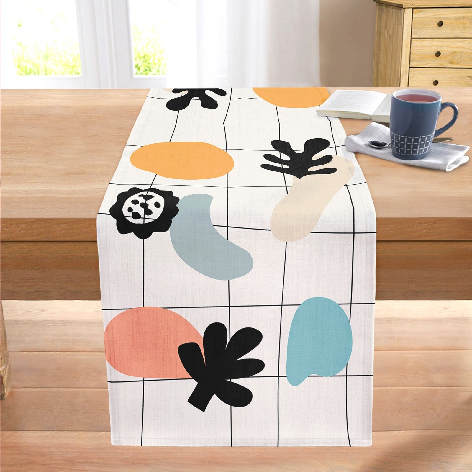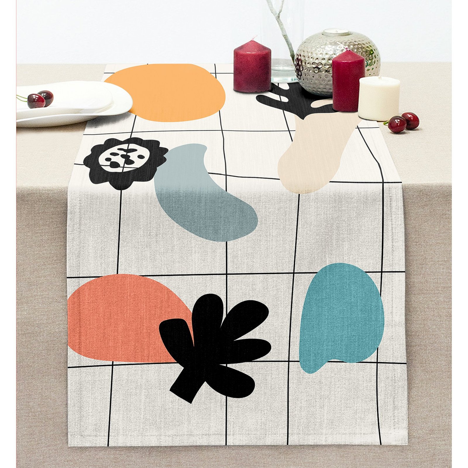 Renkli Zemin Üzerinde Onedraw Çizimli Yaprak Motifli Dijital Baskılı Modern Dikişli Şönil Runner