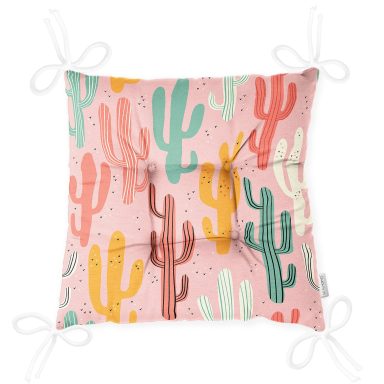 Renkli Zemin Üzerinde Sevimli Kaktüs Desenli Dijital Baskılı Modern Pofidik Sandalye Minderi