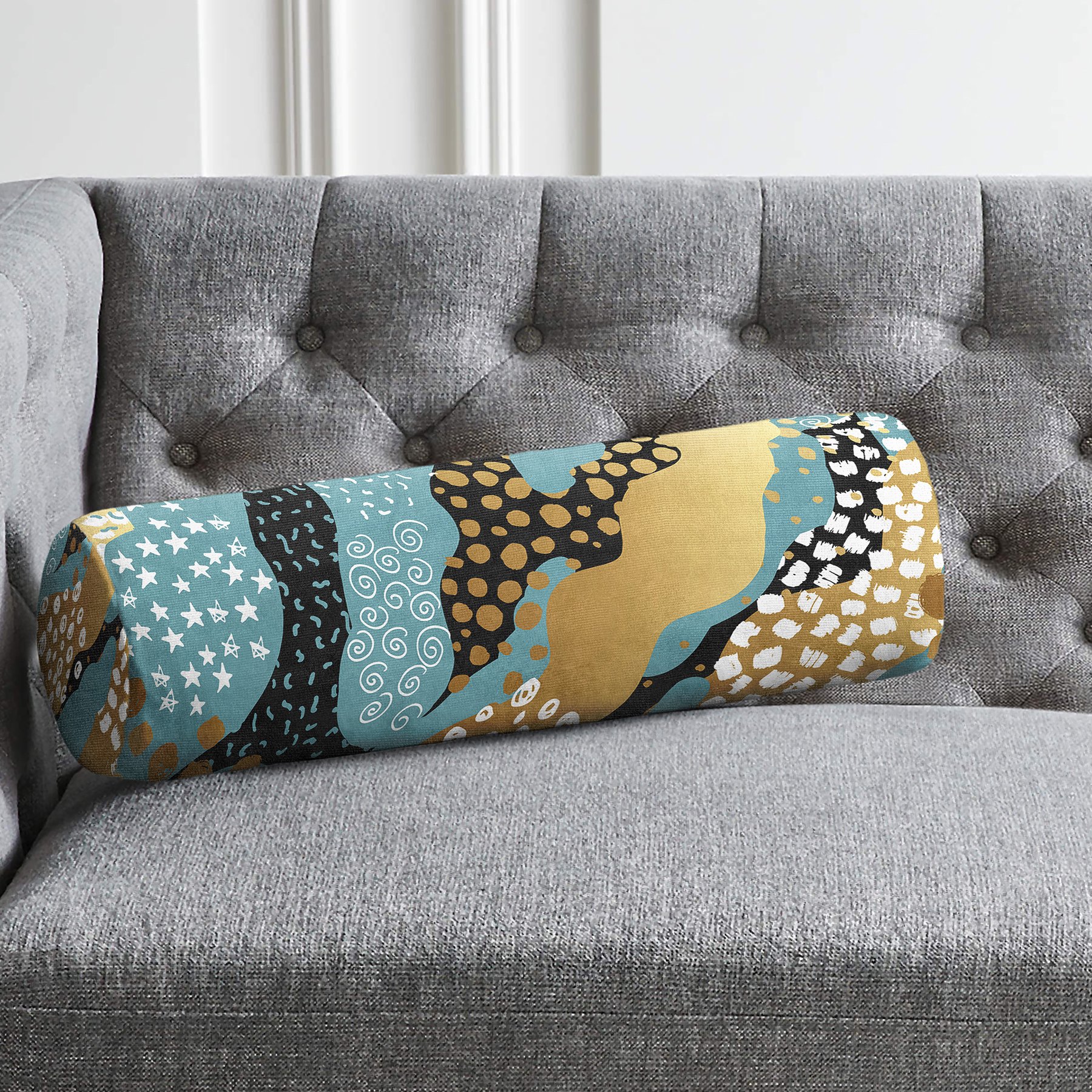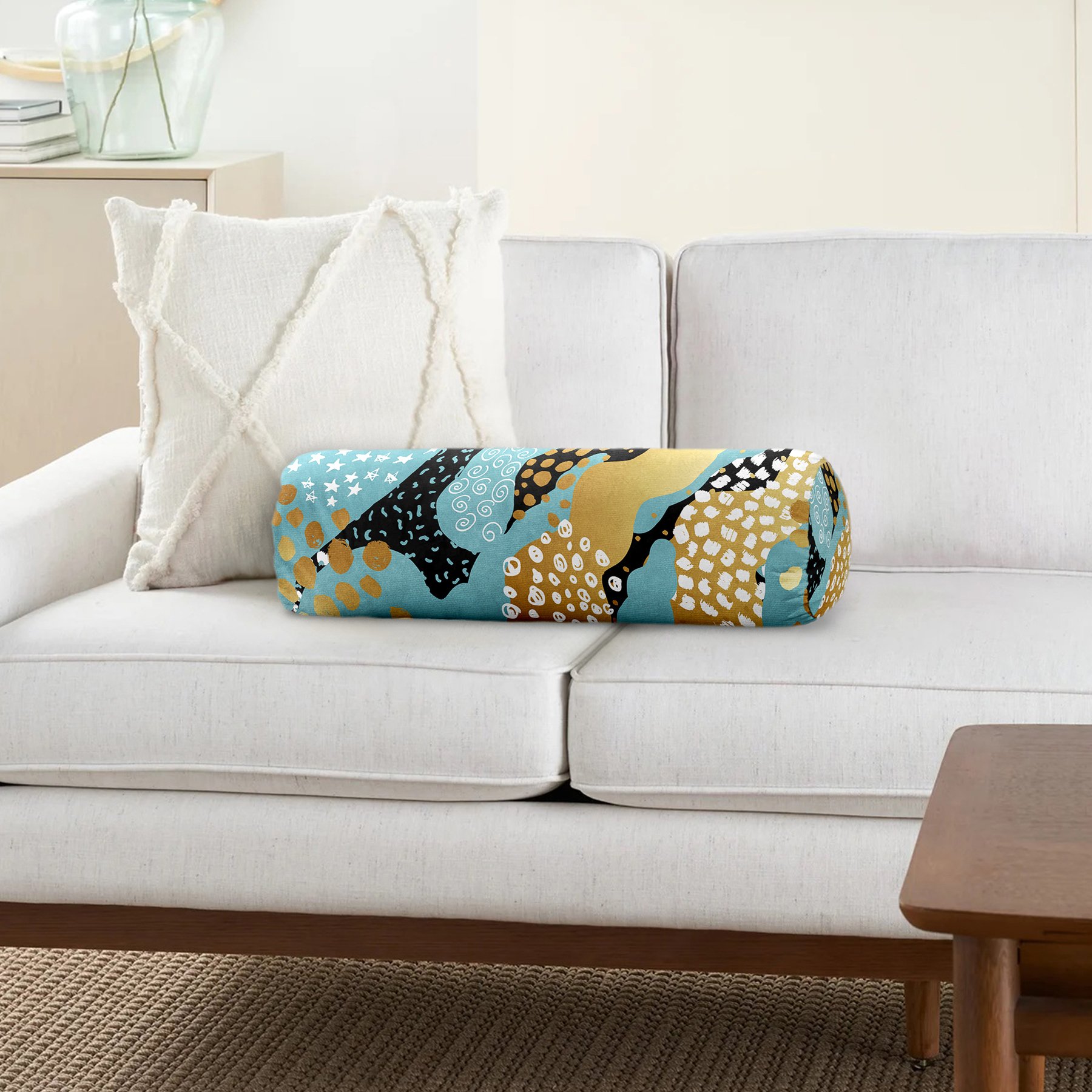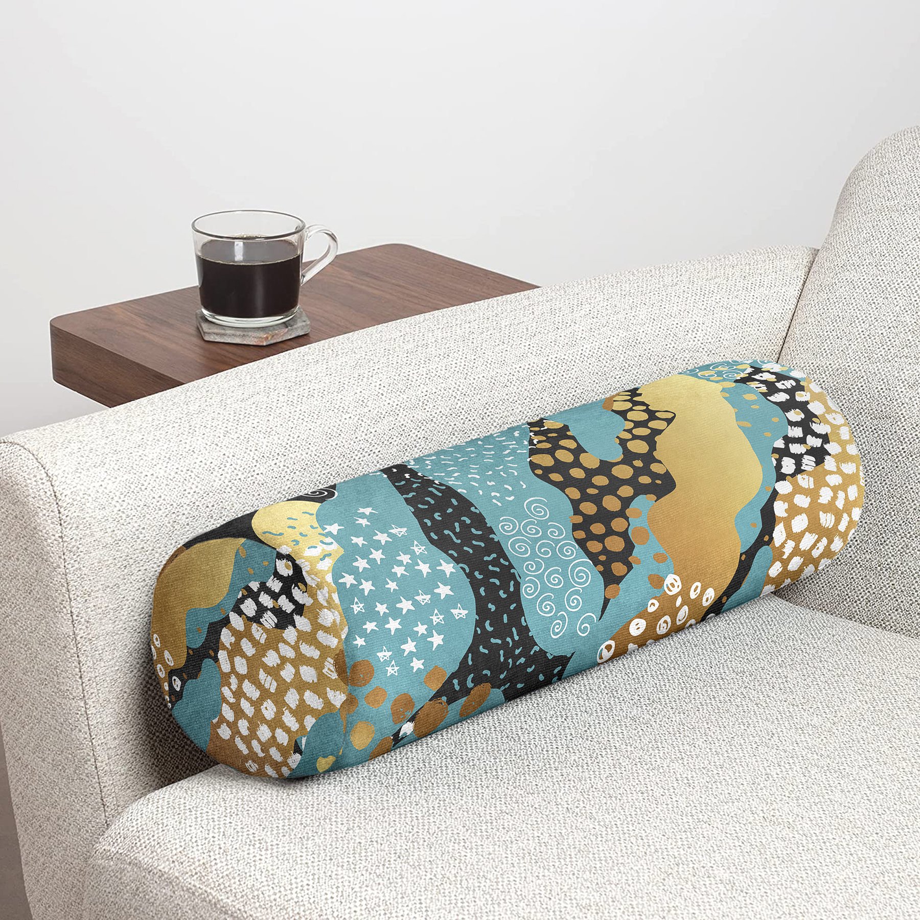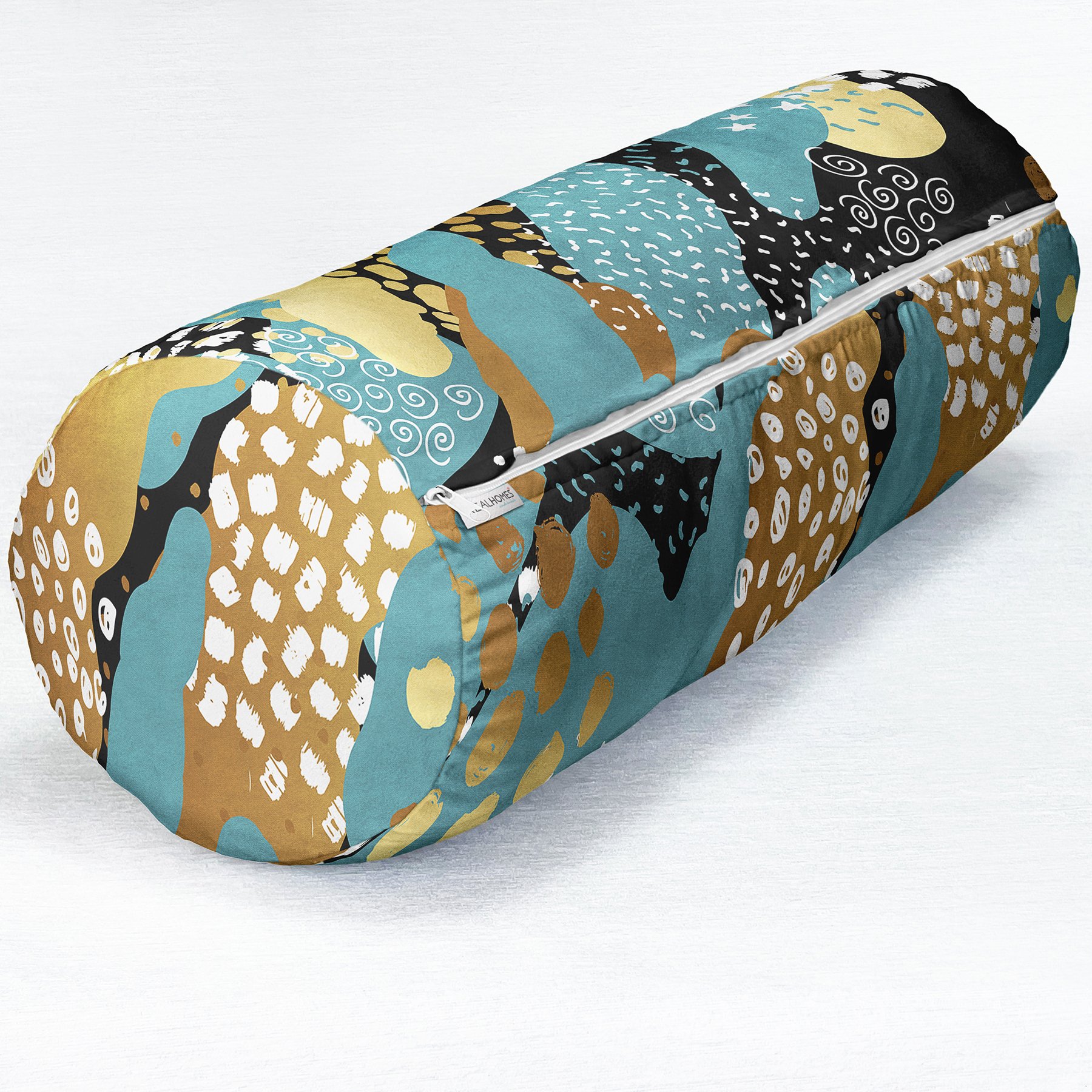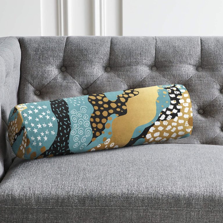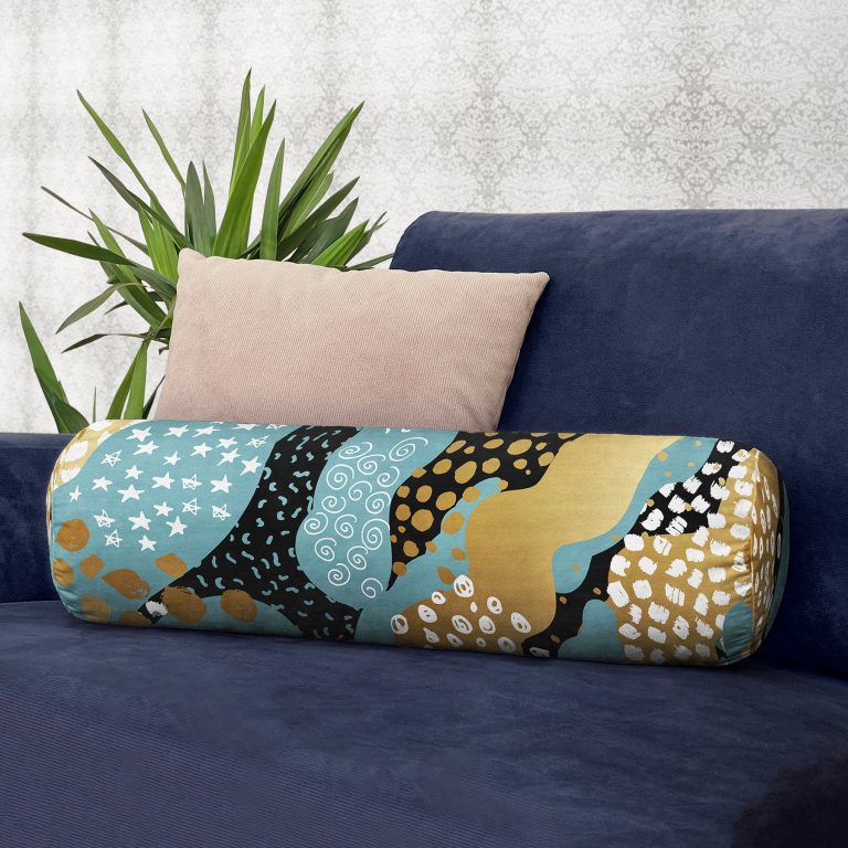 Renkli Zeminde Gold Detaylı Dijital Baskılı Modern İç Dolgulu – Fermuarlı Süet Silindir Daire Yastık Kırlent