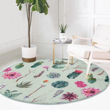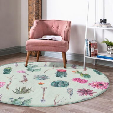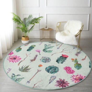 Renkli Zeminde Kaktüs Desenli Dijital Baskılı Yeşil Outdoor Yıkanabilir Kaymaz Tabanlı Yuvarlak Halı