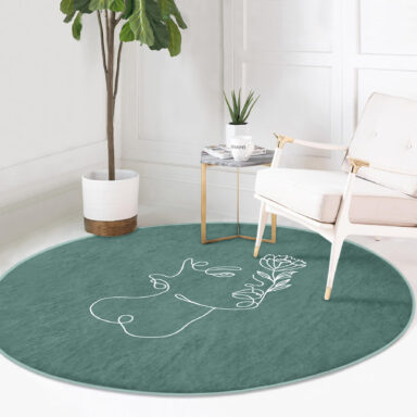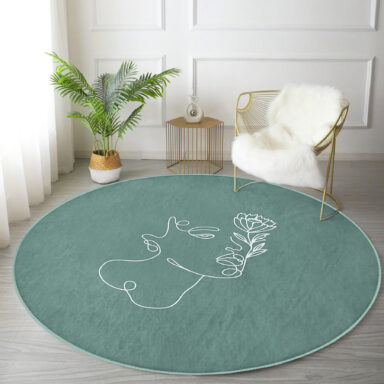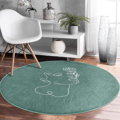 Renkli Zeminde Onedraw Çizimli Bayan Silüeti Turkuaz Salon Oturma Odası Kaymaz Tabanlı Yuvarlak Halı