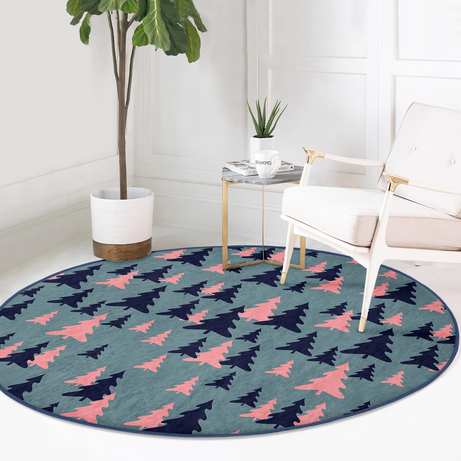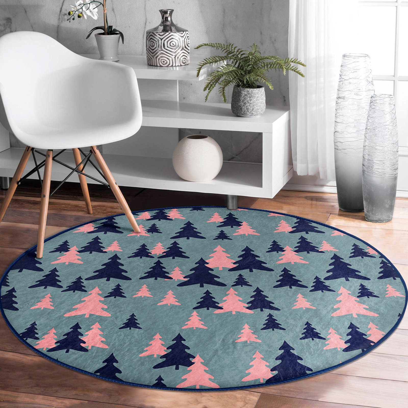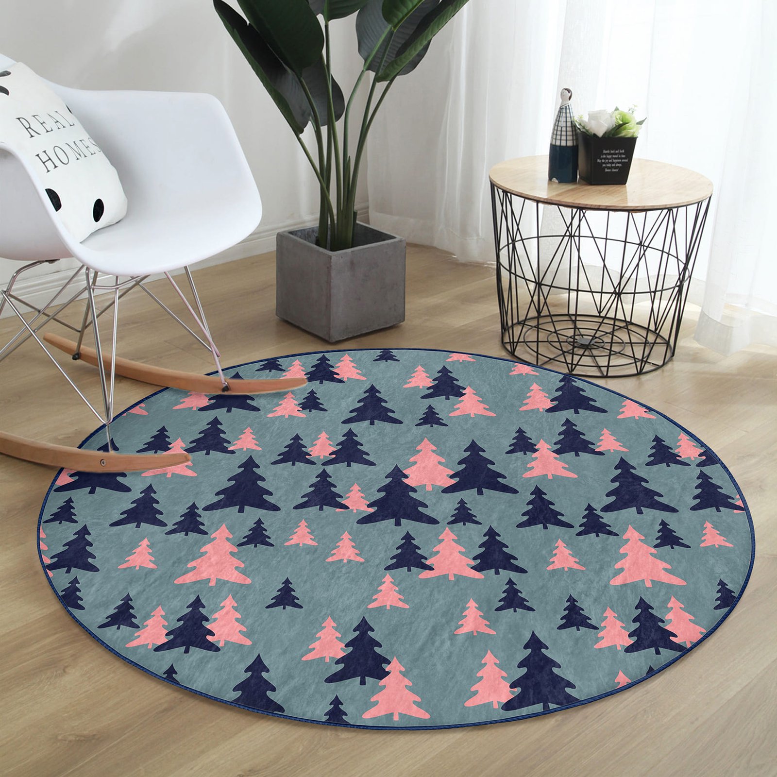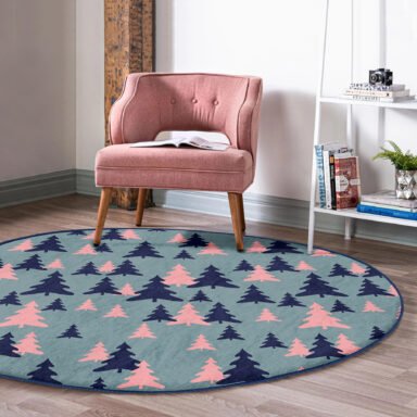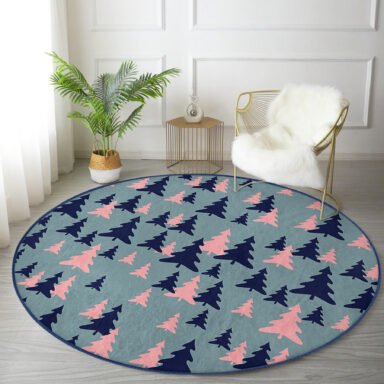 Renkli Zeminde Pastel Siyah Çam Ağacı Desenli Lacivert Oturma Odası Kaymaz Tabanlı Yuvarlak Halı
