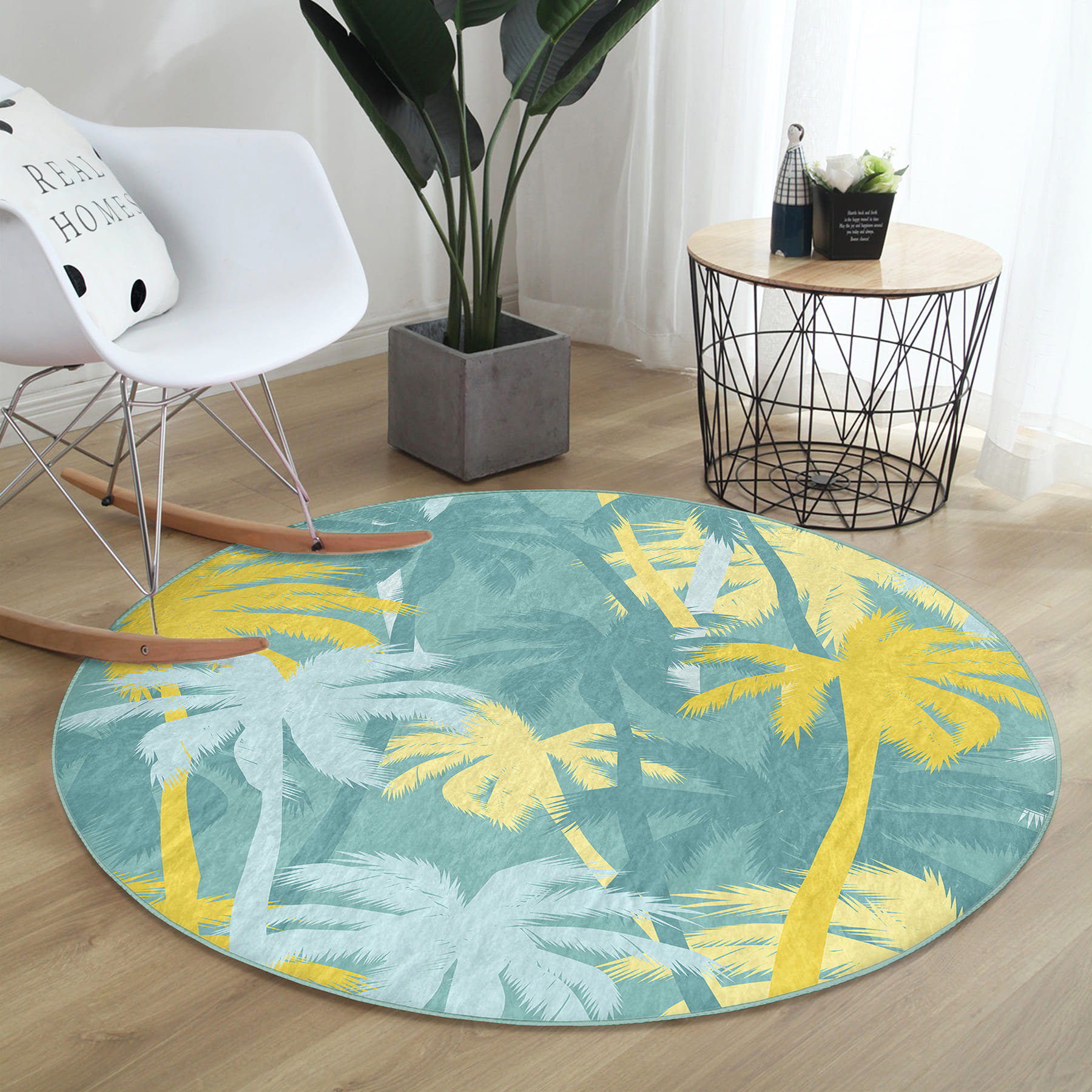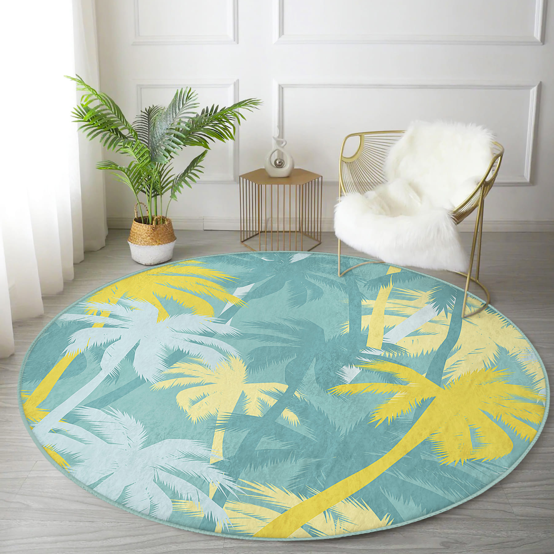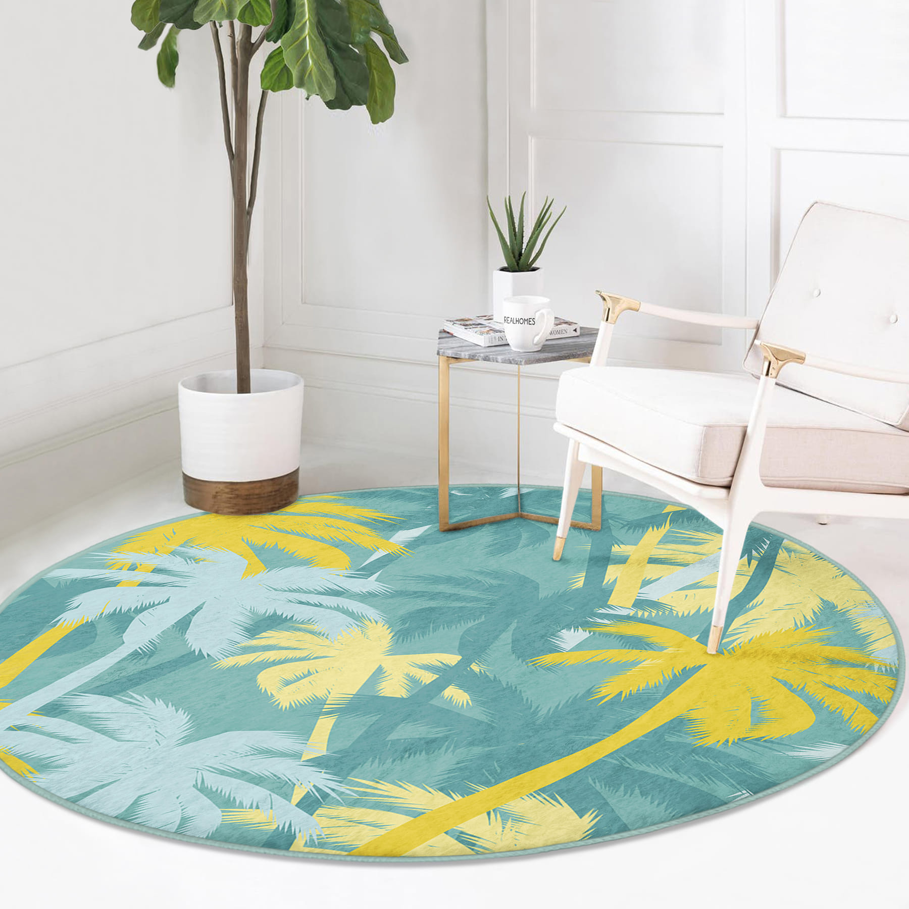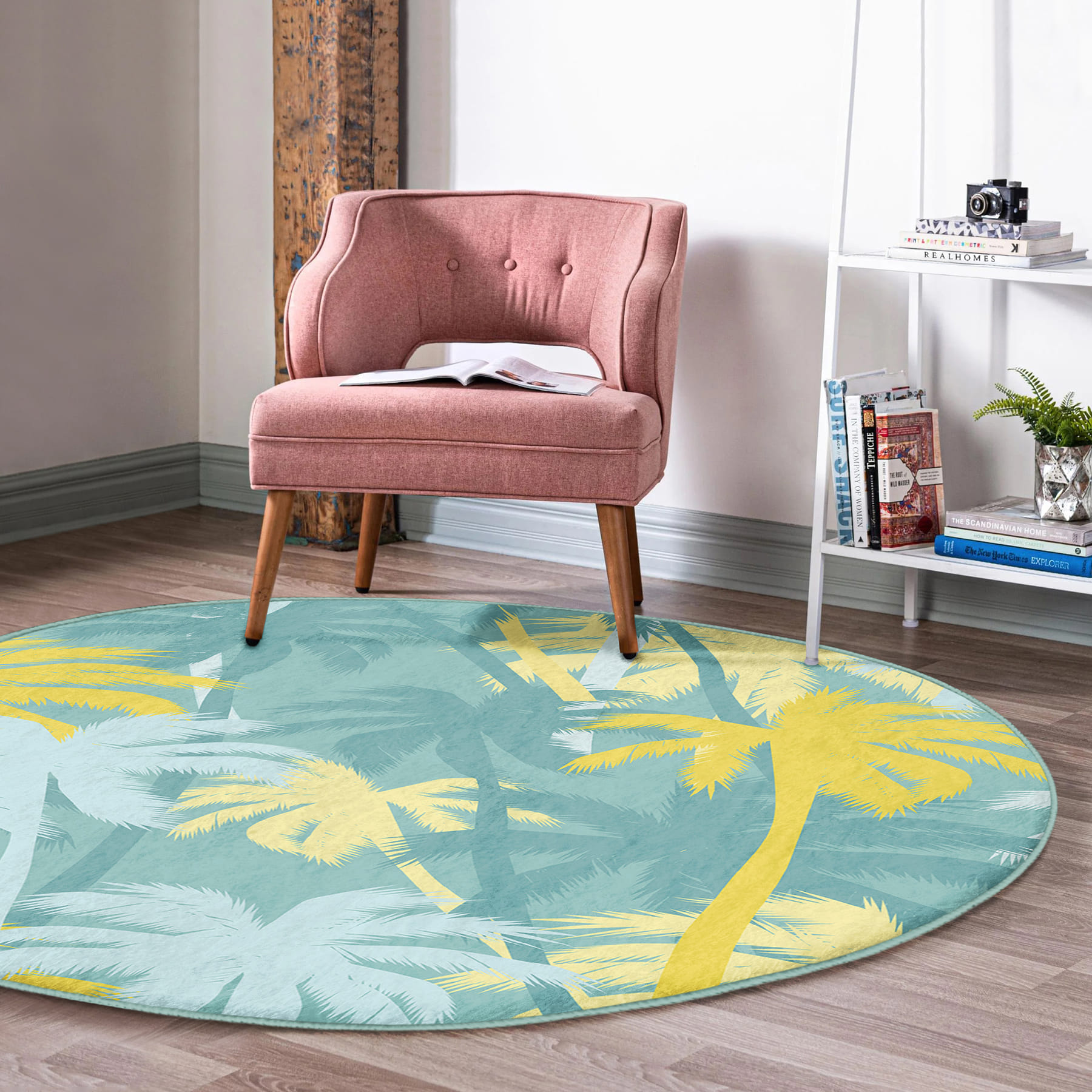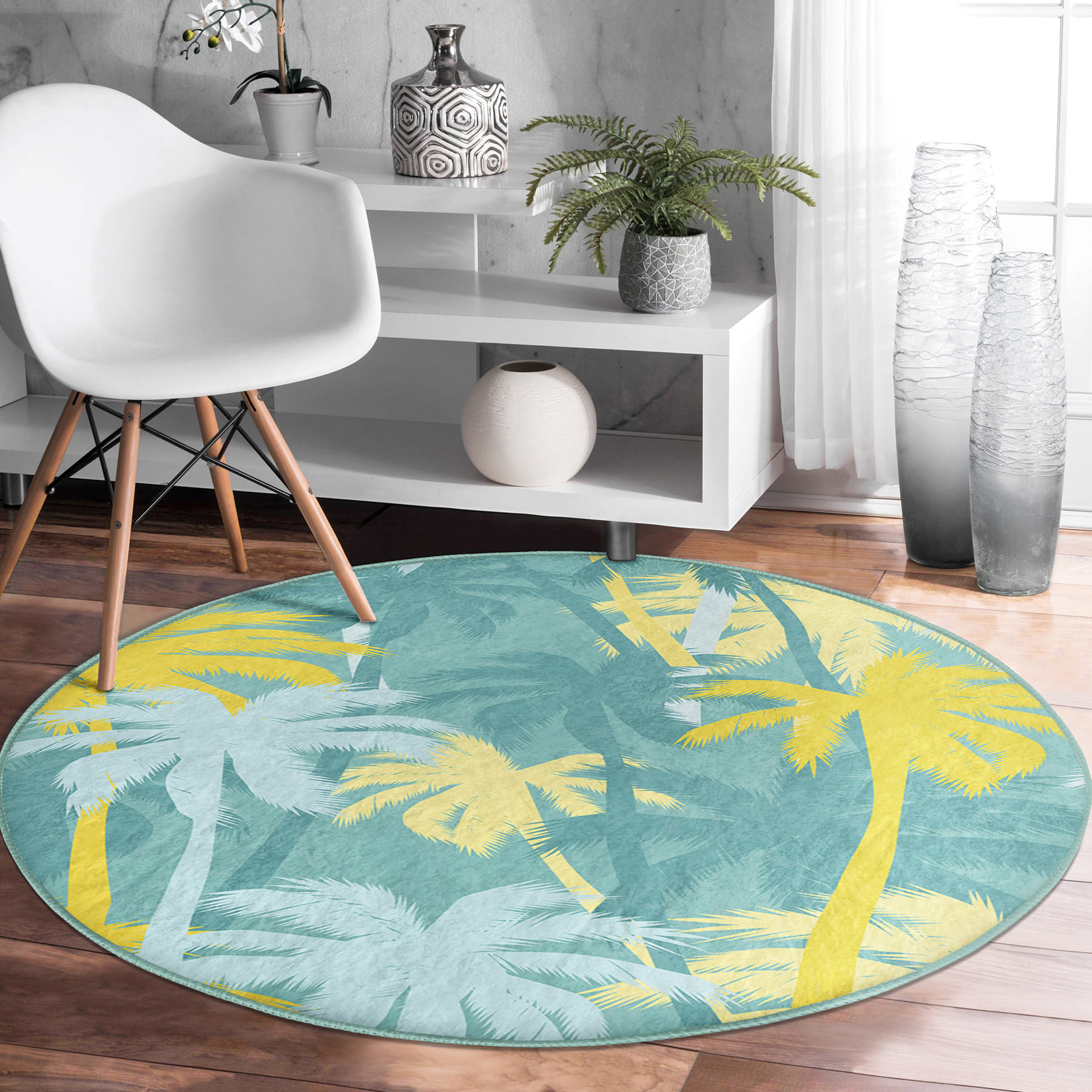 Renkli Zeminde Soyut Çizimli Palmiyeler Modern Turkuaz Mutfak Yıkanabilir Kaymaz Taban Yuvarlak Halı