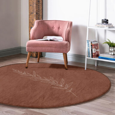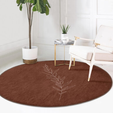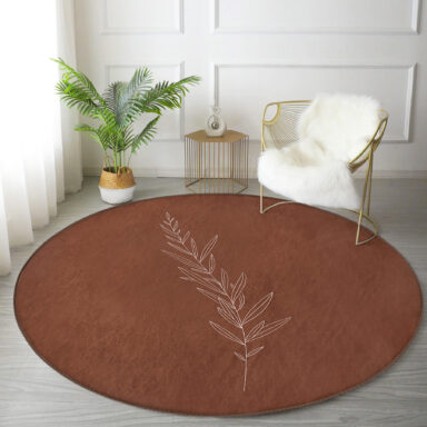 Renkli Zeminde Yaprak Desenli Kahverengi Salon Oturma Odası Yıkanabilir Kaymaz Tabanlı Yuvarlak Halı