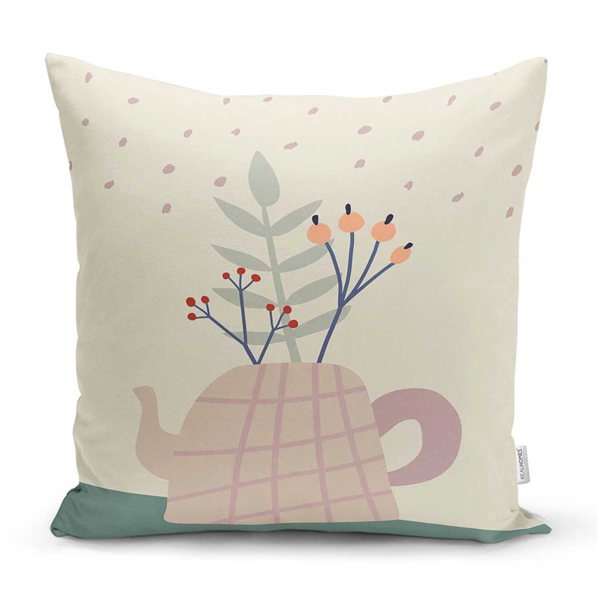 Renkli Zeminli Onedraw Çizimli Yaprak Desenli Dijital Baskılı Modern Yastık Kılıfı