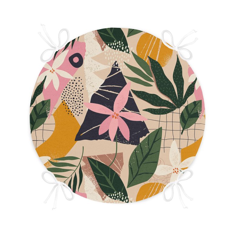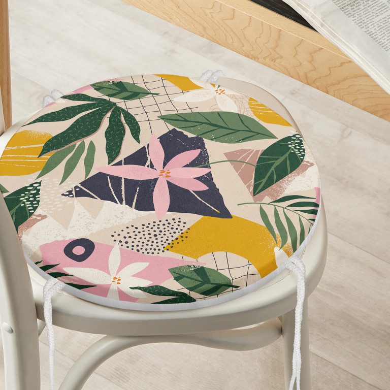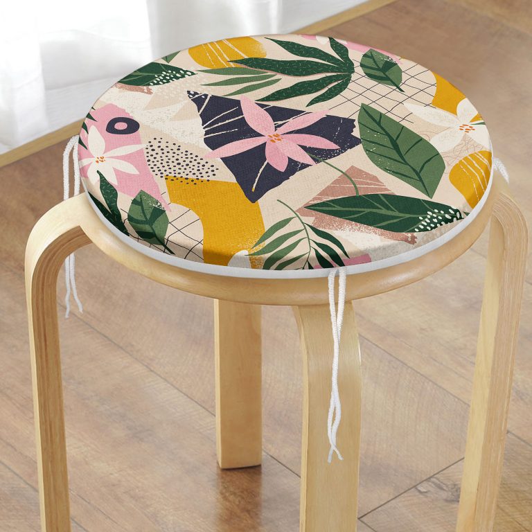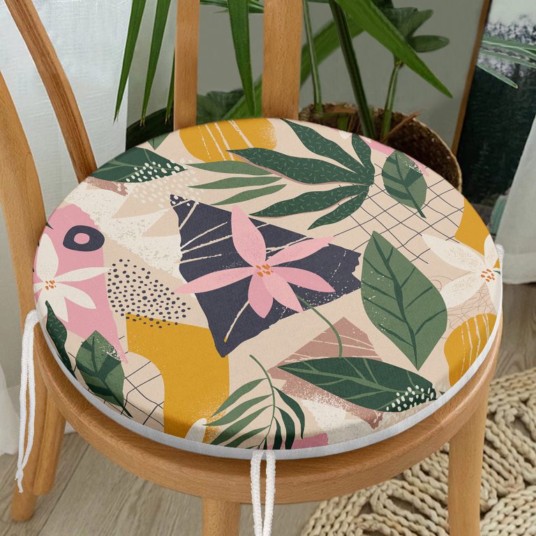 Renkli Zeminli Yaprak Desenli Onedraw Çizim Dijital Baskılı Modern Yuvarlak Fermuarlı Sandalye Minderi