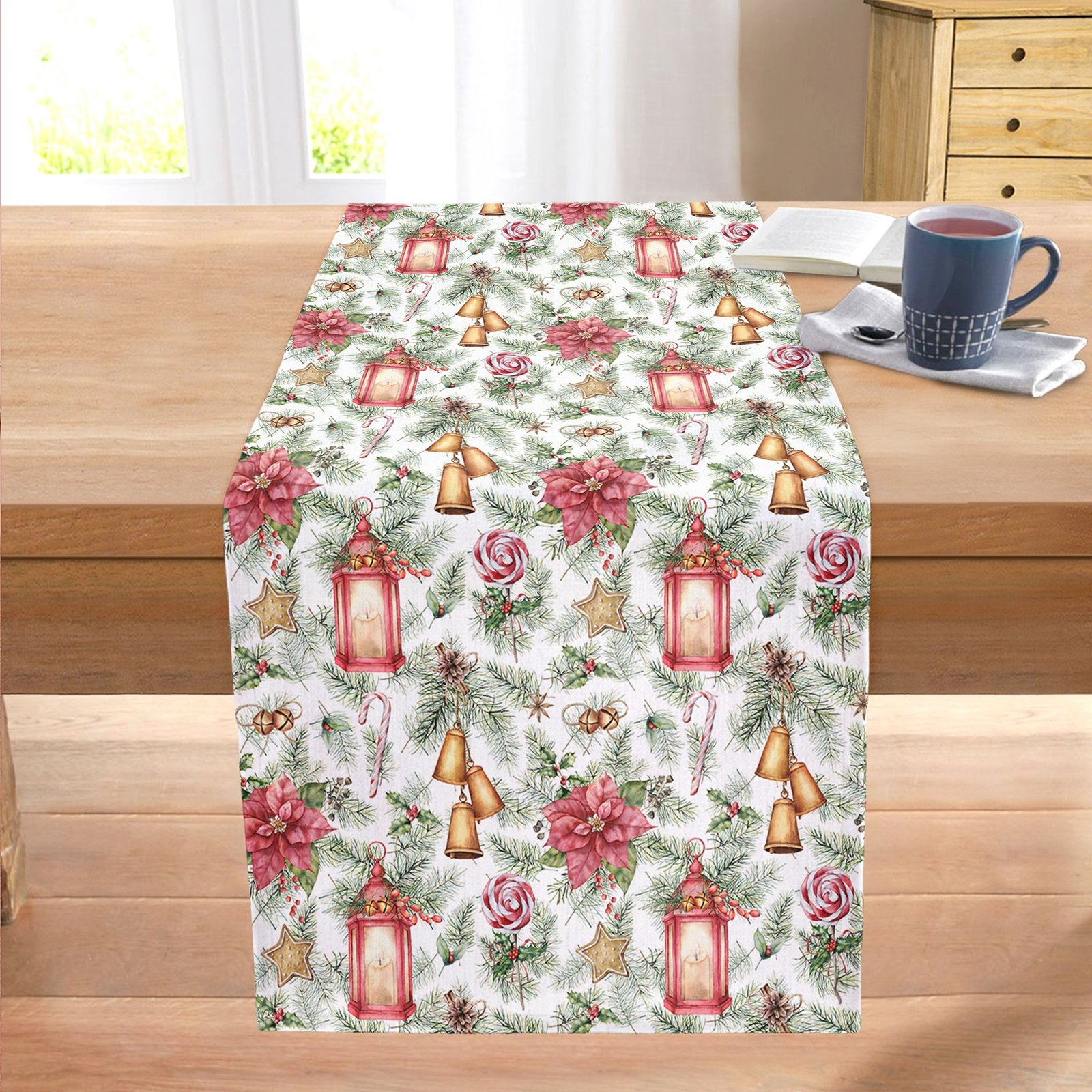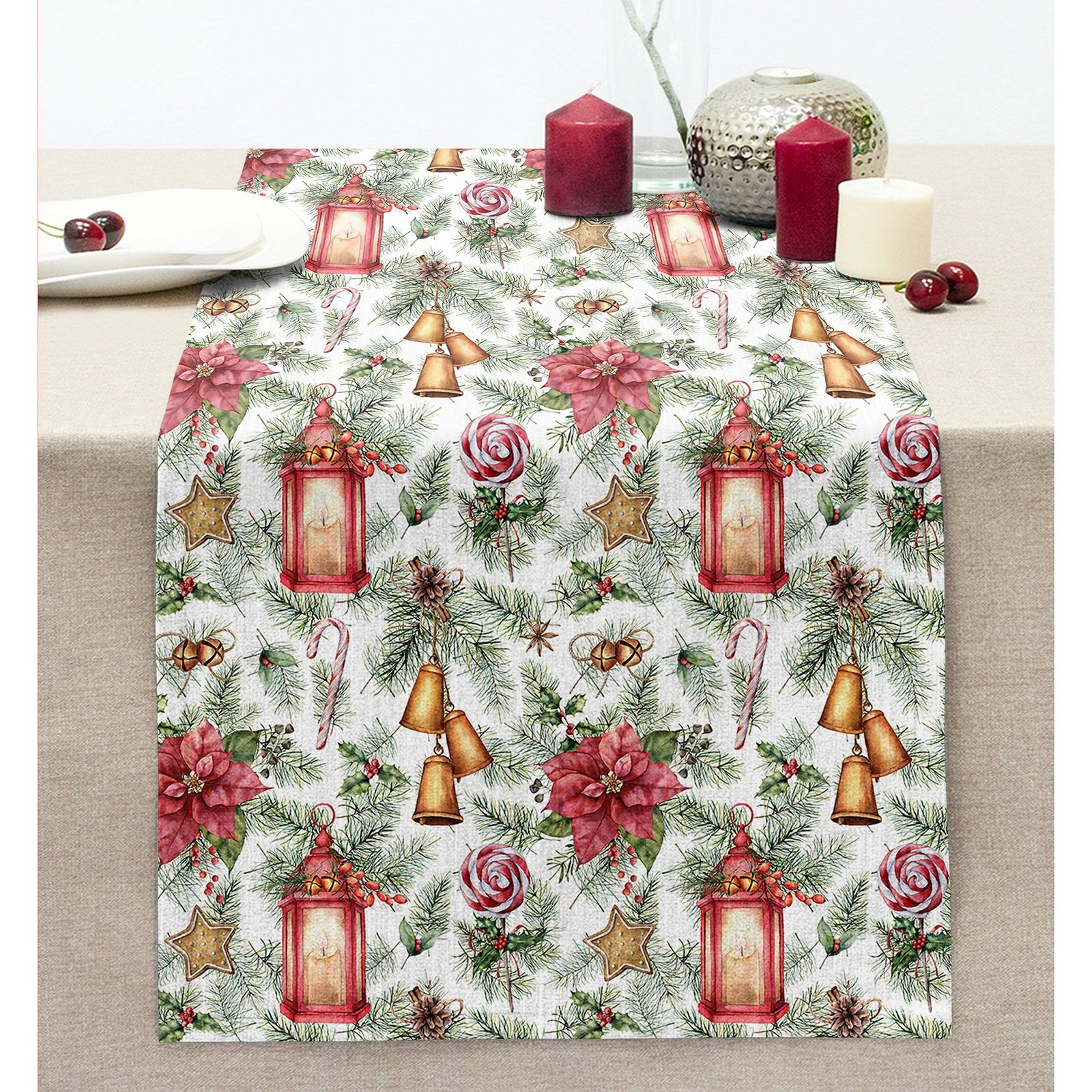 Şamdan Tasarımlı Yılbaşı Konseptli Dijital Baskılı Dekoratif Dikişli Şönil Runner