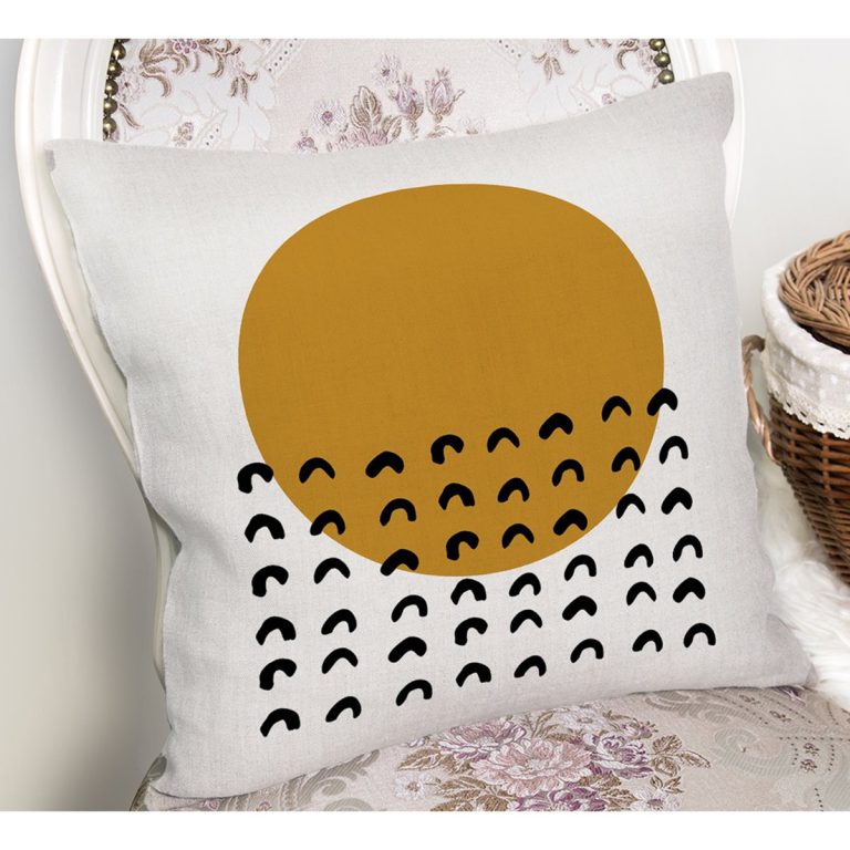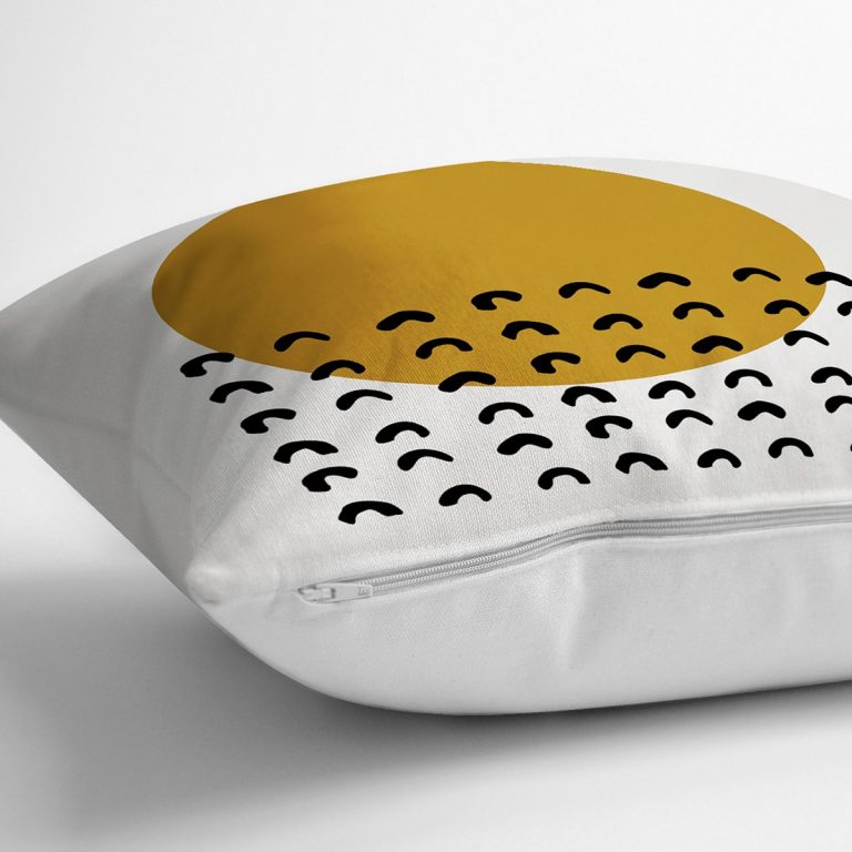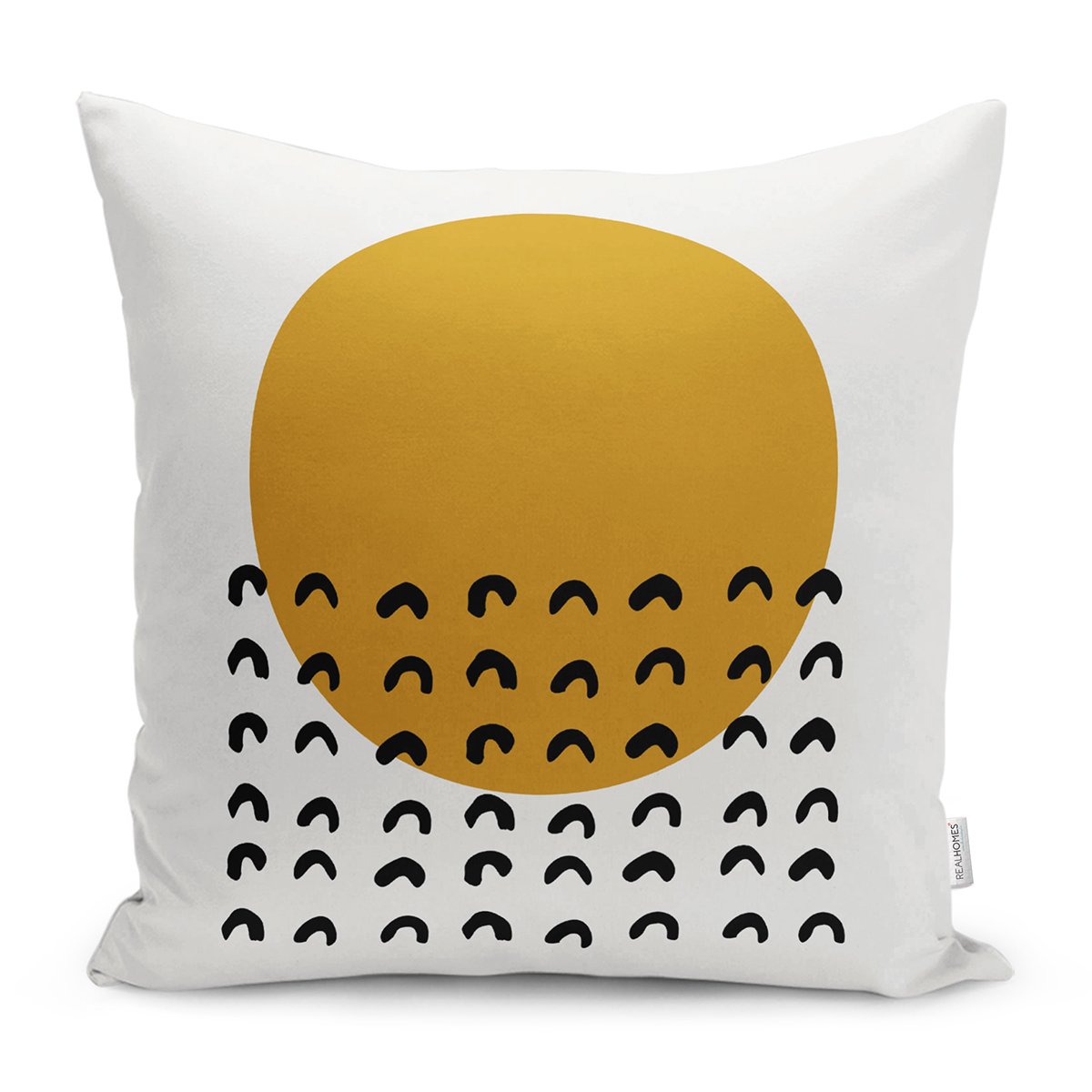 Sanatsal Beyaz Zemin Sarı Yuvarlak Tasarımlı Yastık Kırlent Kılıfı