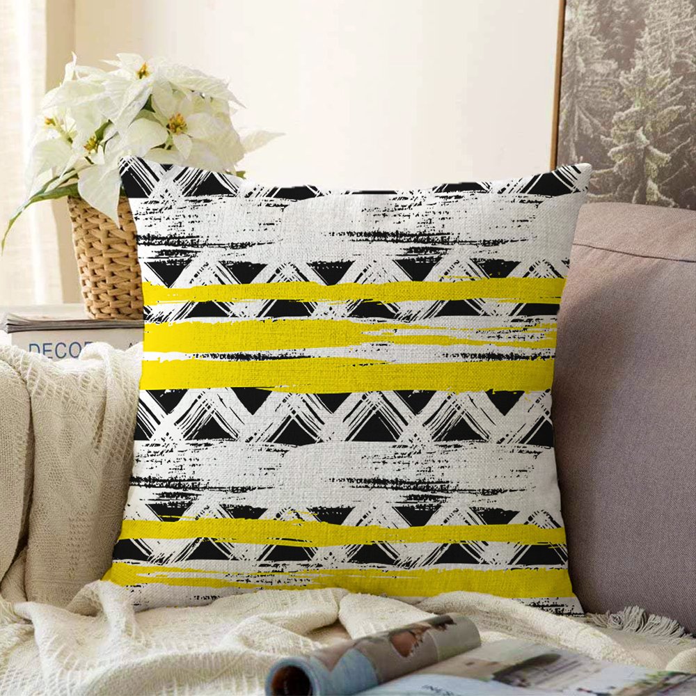 Sarı Siyah Üçgen ve Çizgiler Desenli Dekoratif Raşel Yastık Kırlent Kılıfı