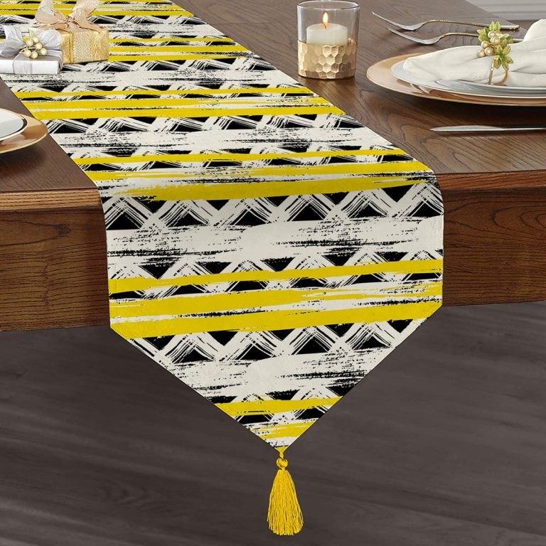 Sarı Siyah Üçgen ve Çizgiler Desenli Dekoratif Püsküllü Şönil Üçgen Runner