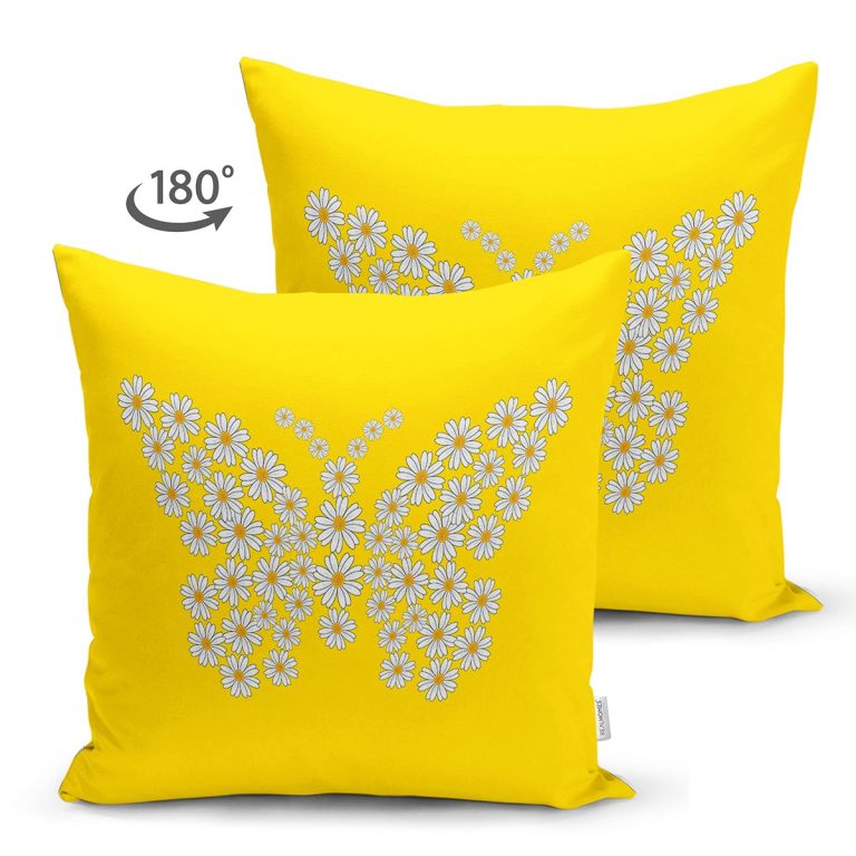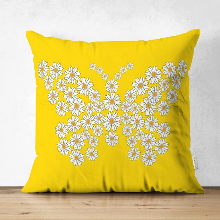 Sarı Zemin Papatyadan Kelebek Tasarımlı Dijital Baskılı Dekoratif Süet Yastık Kırlent Kılıfı