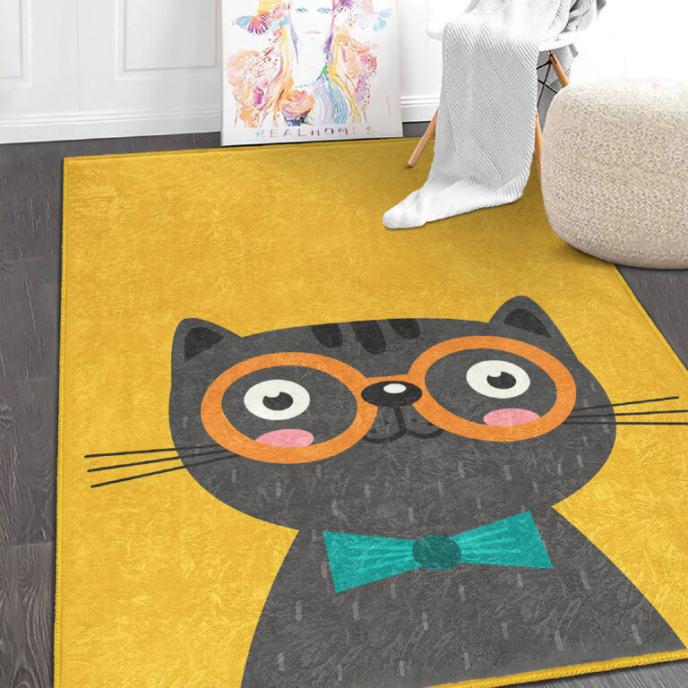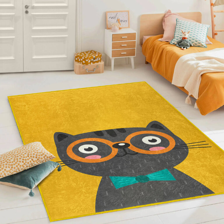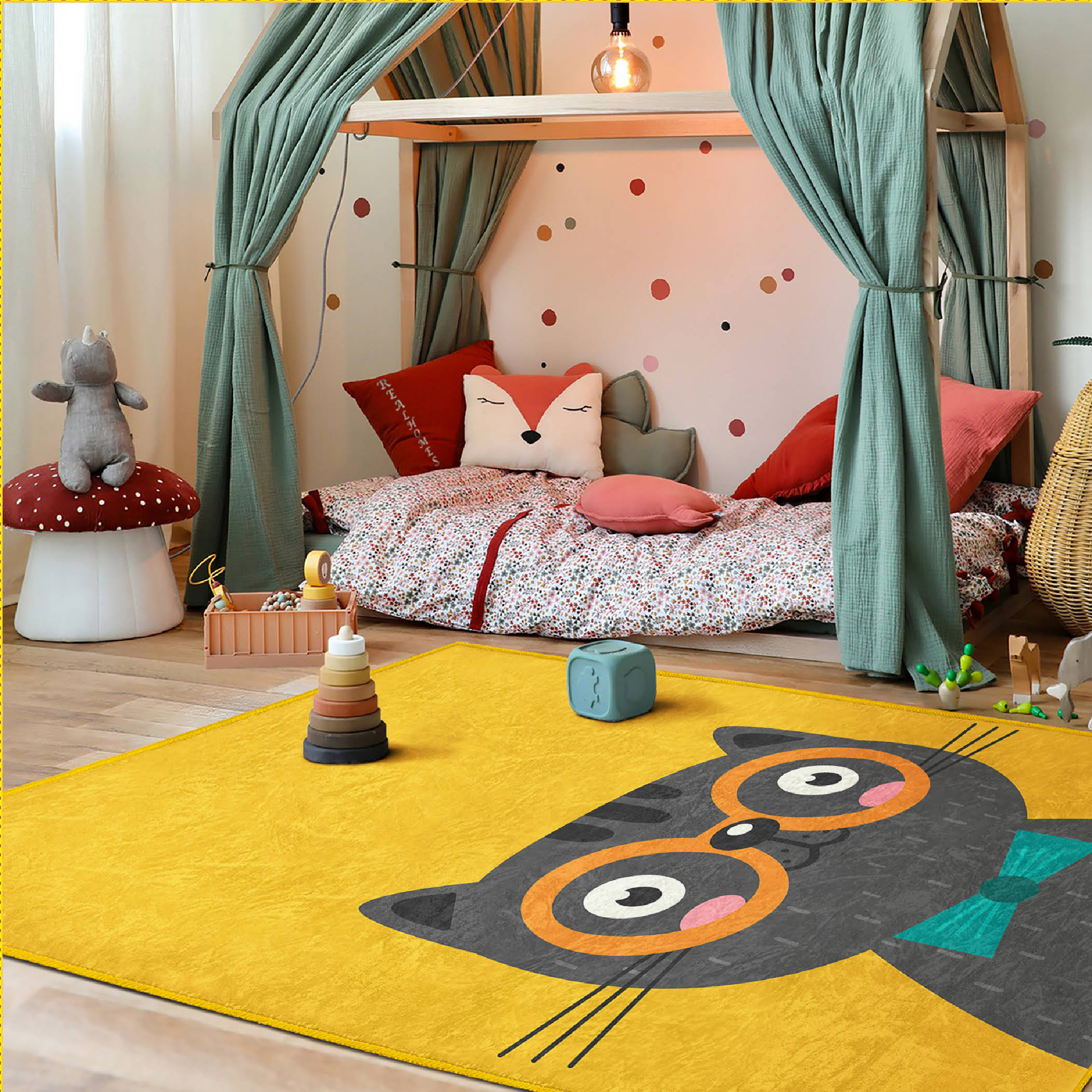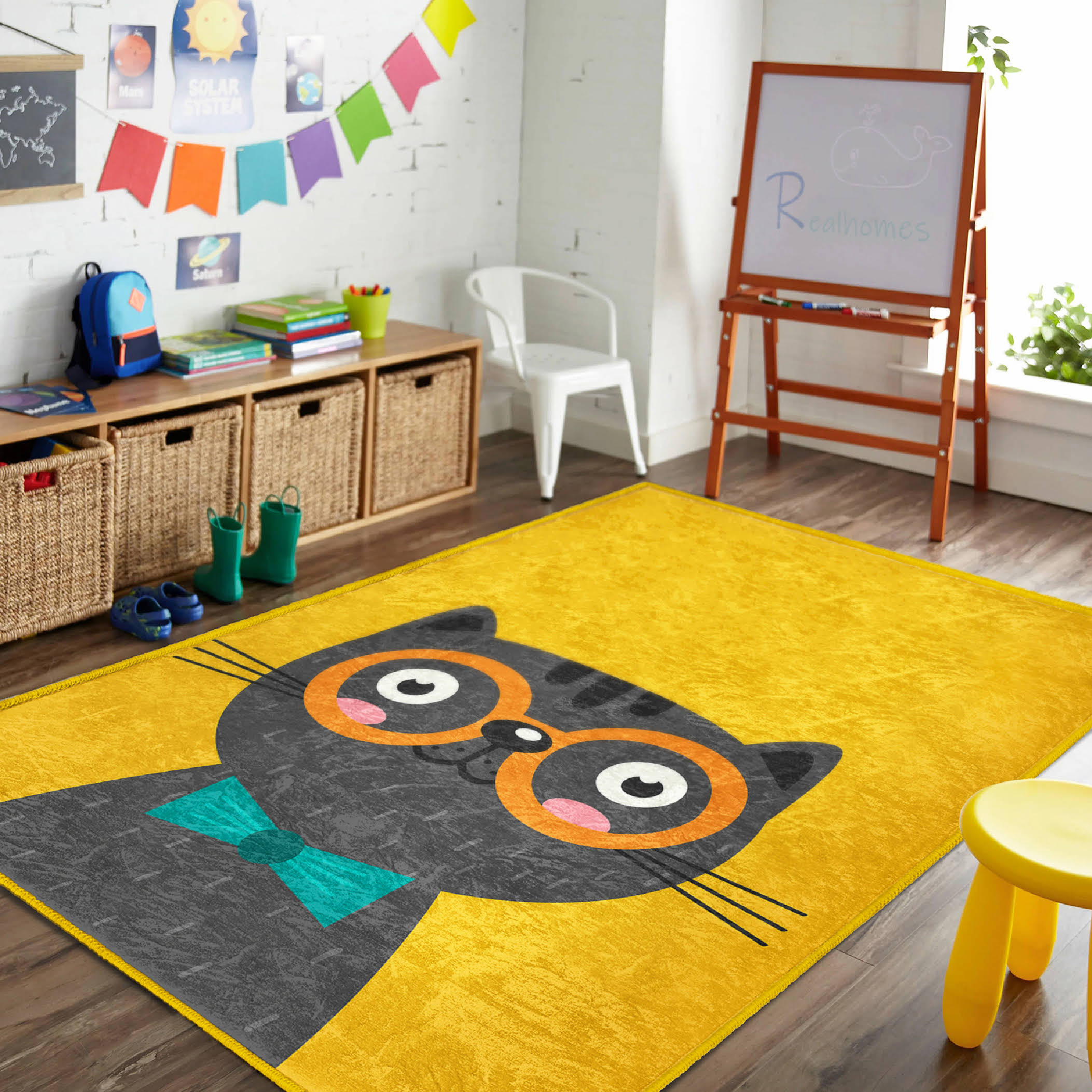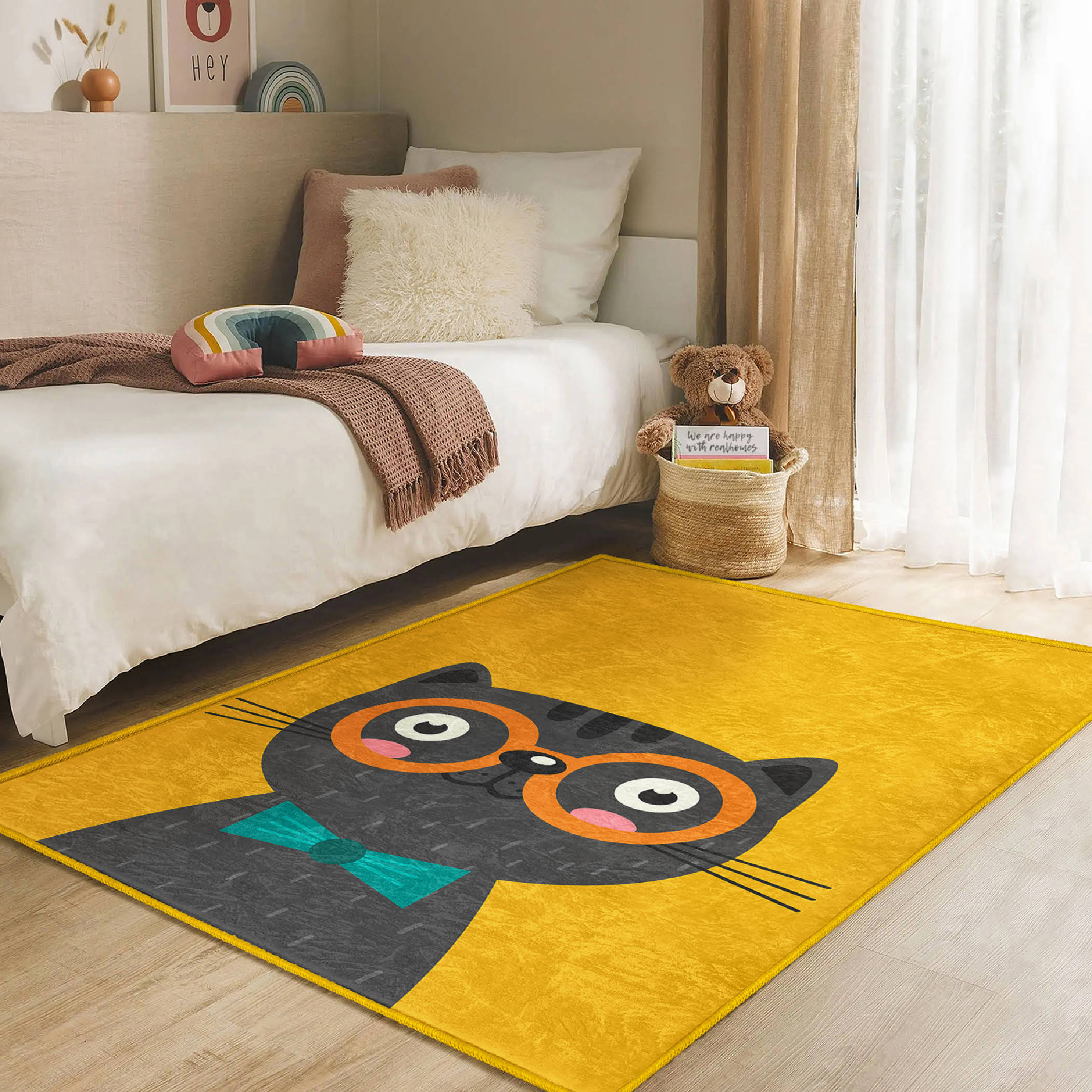 Sarı Zeminde Sevimli Kedi Desenli Yıkanabilir Kaymaz Taban Çocuk Halısı